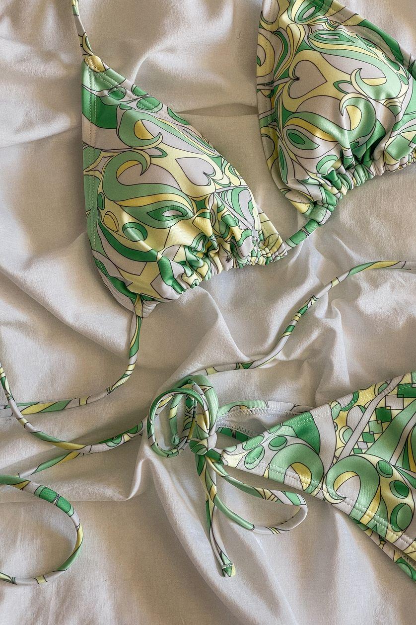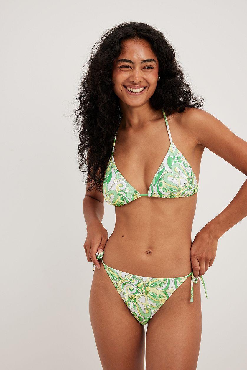 This bikini bottom features stretchy swimsuit material and a high waist fit. It has a high cut leg and a self tie closure on the sides.