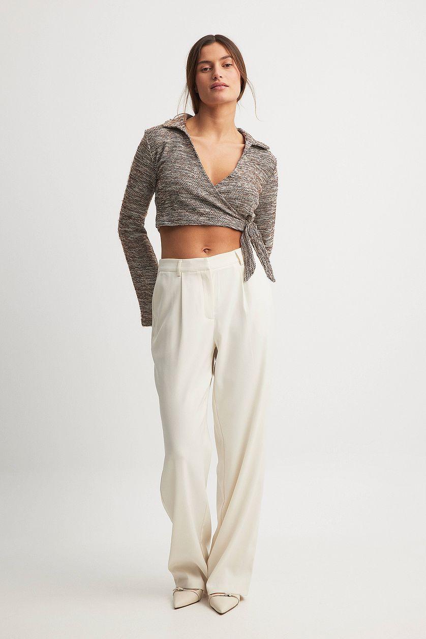This long sleeve top features cropped length and a wrap design with a self tie detail. It has a classic collar and a v neckline. Our long sleeve top features trumpet sleeves.