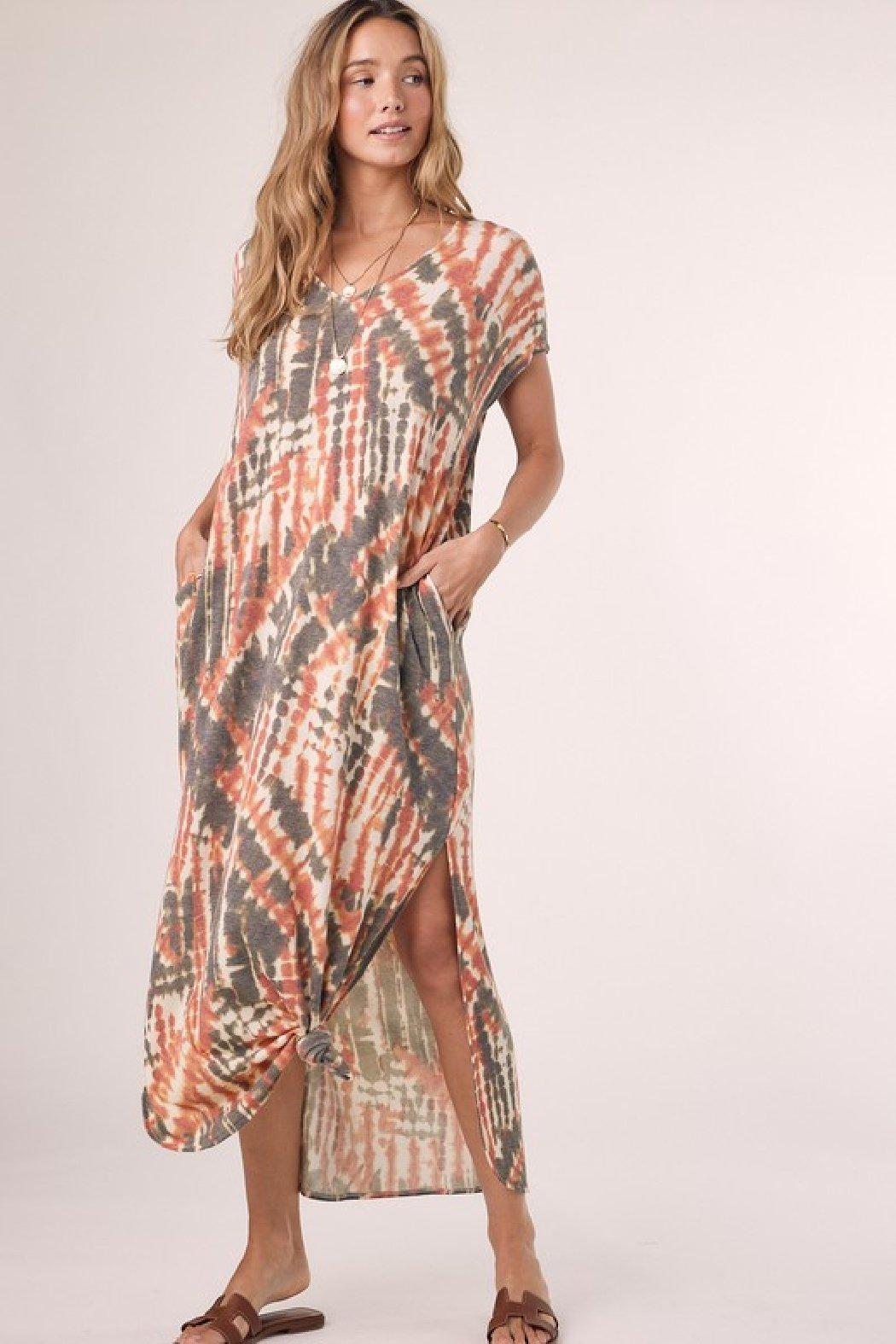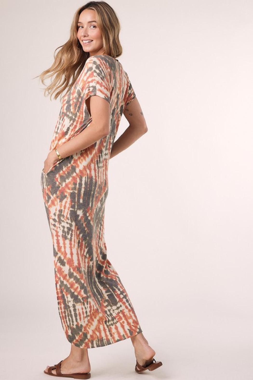 Tie-dye casual maxi jersey dress featuring v-neckline, short sleeves, side pockets, and side slits on both sides. Wear it casual and long or add a knot at the bottom for a more stylish look.