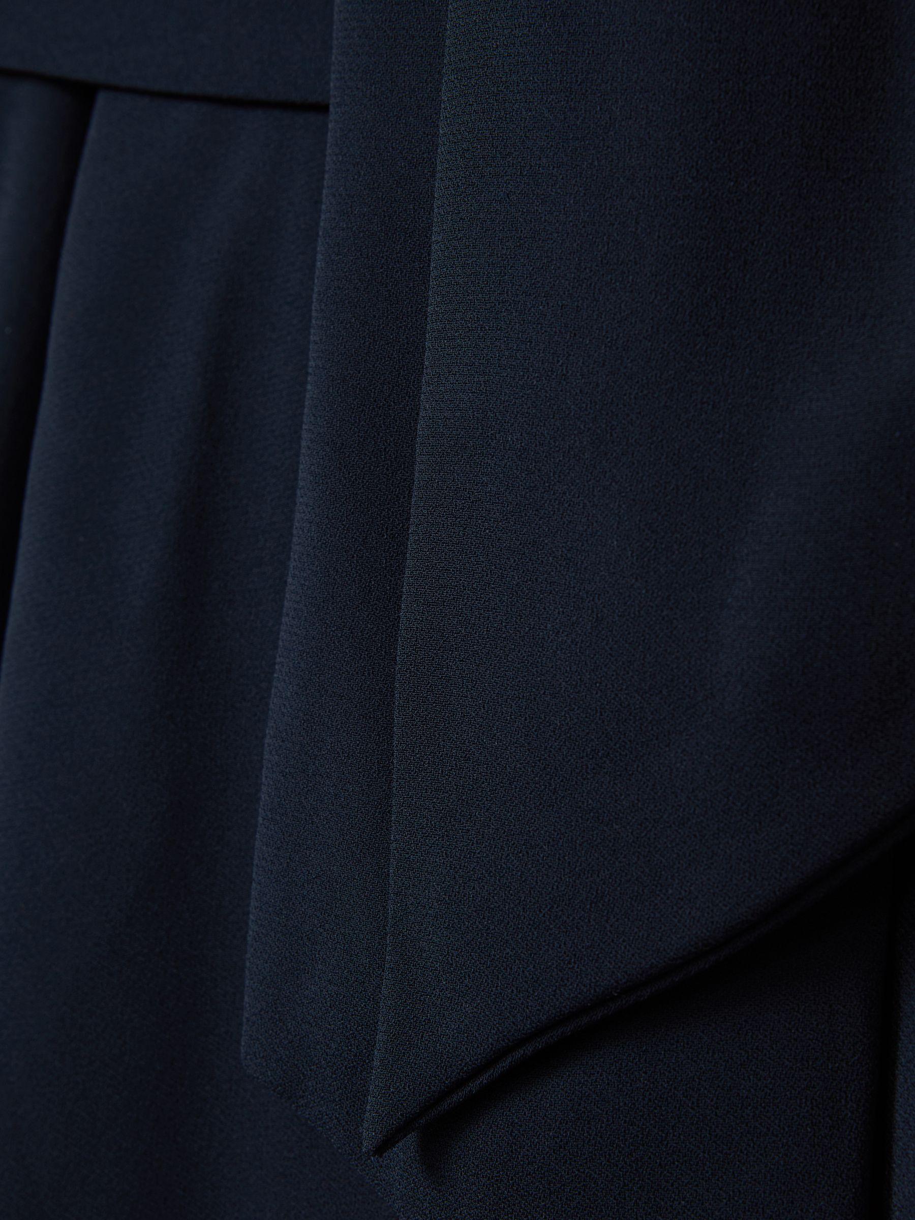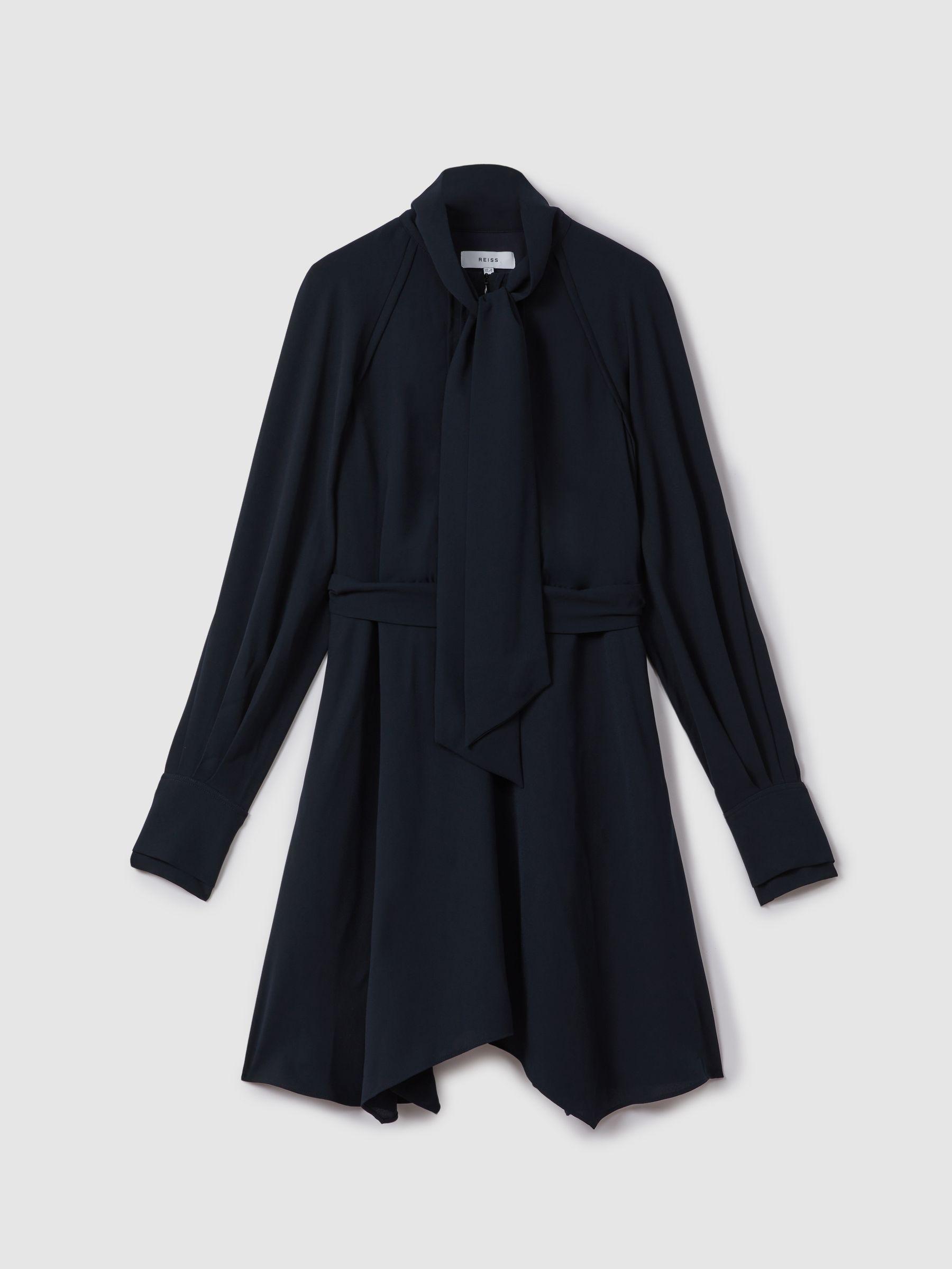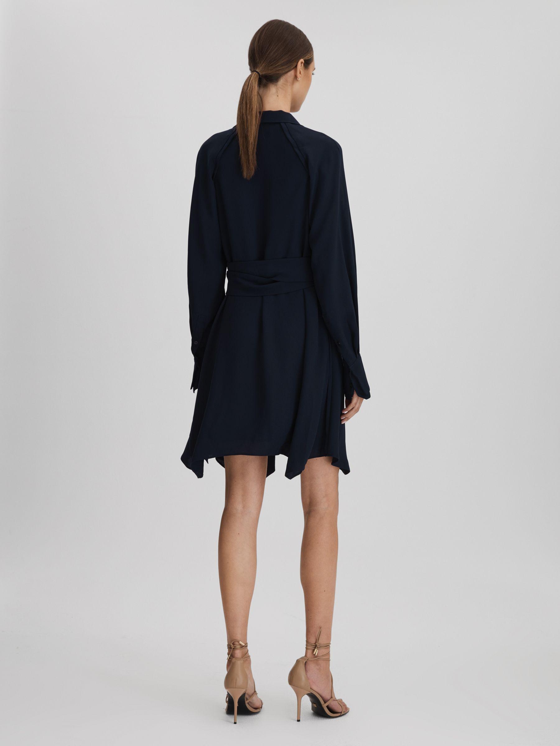 The navy Ellie mini dress is designed with a zip front closure and a versatile tie neck. Pintuck detailing features to the front and the cuffs are layered. A belt cinches the shape before falling to an asymmetric finish. Zip front closure Pintuck detailing Layered buttoned cuffs Tie neck Raglan sleeves Side-slip pockets Self-tie waist belt Asymmetric mini length Lined The model is wearing a size 8 Measurements of model: 5ft8 / 172.7cm