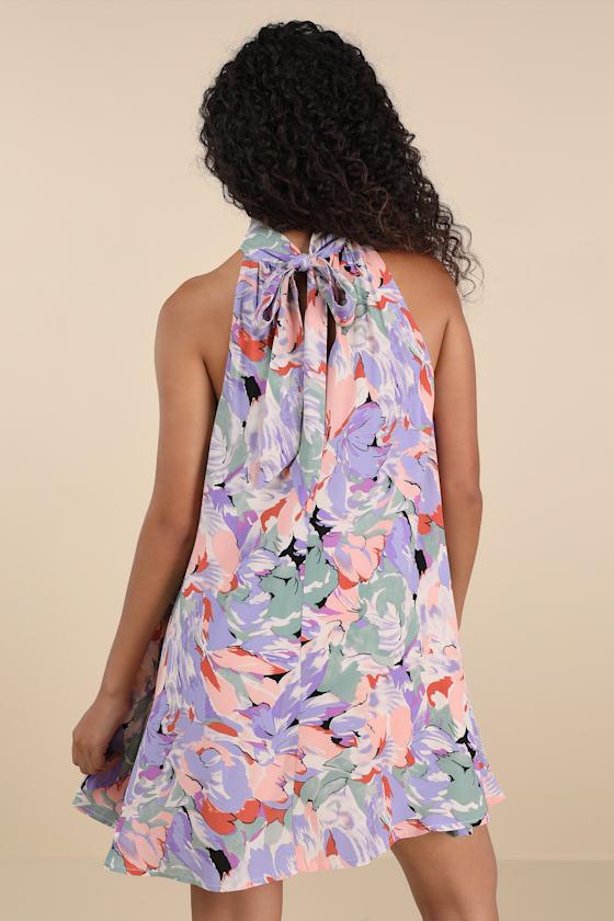 Tie together your look with the ever-so-chic Lulus Tied Back To You Lavender Multi Floral Print Mini Shift Dress! This perfect day-event dress has a colorful floral print that sweeps across woven chiffon and shapes a tying halter neckline (above a keyhole cutout) and a sleeveless bodice. A shift silhouette ends at a flirty mini hem.
