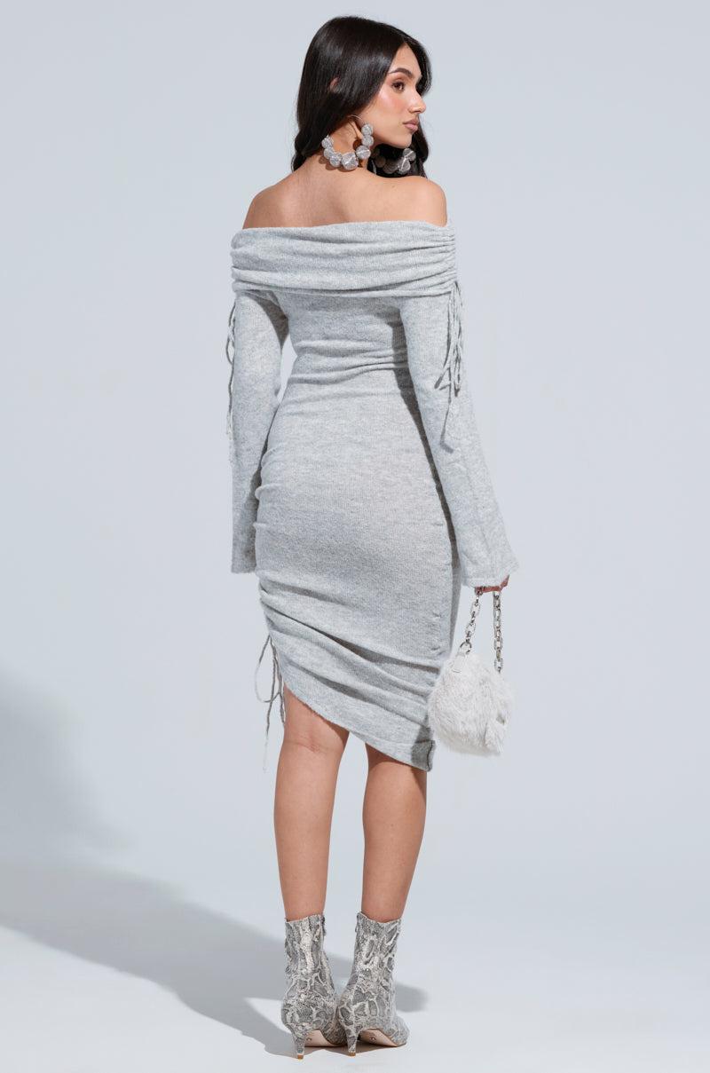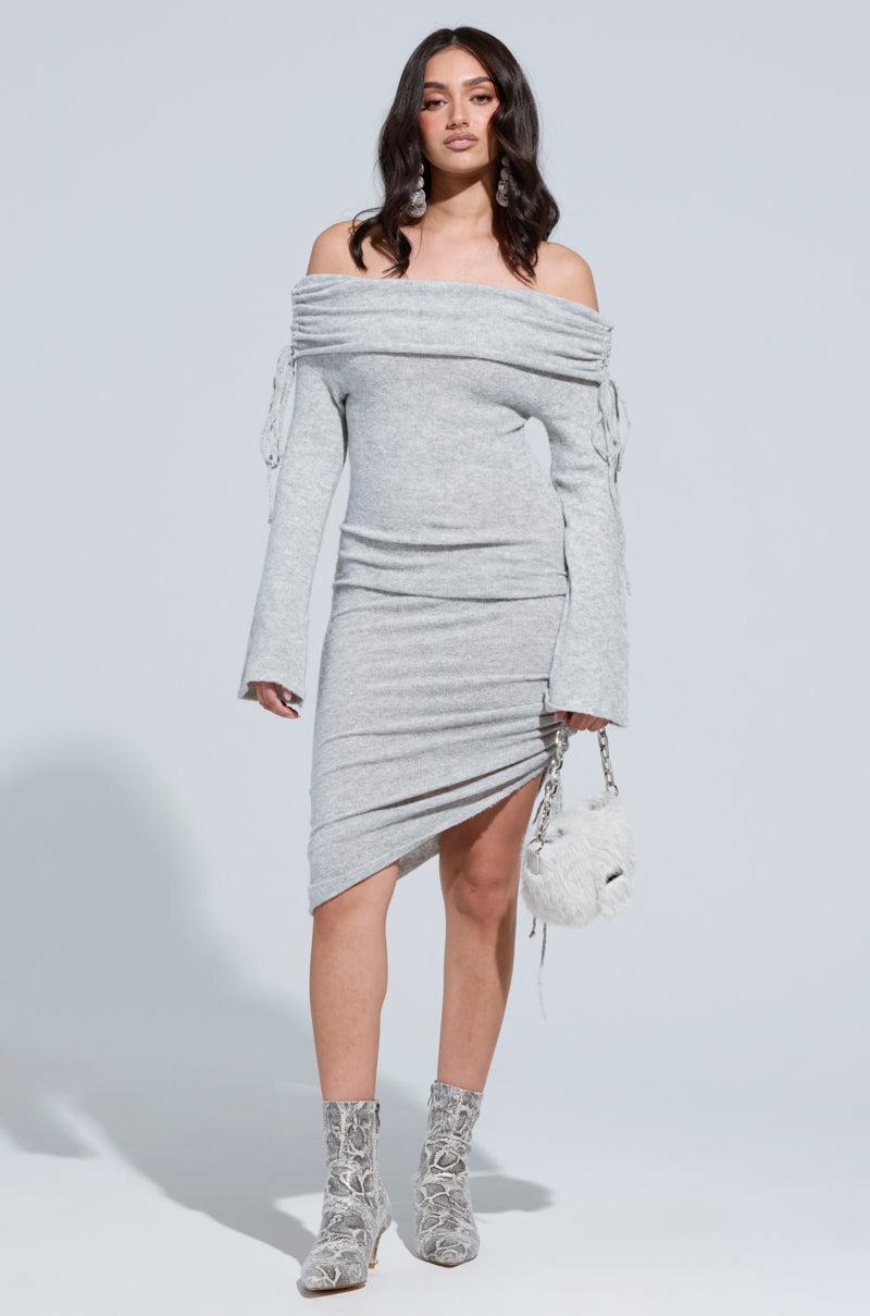 The AKIRA Label Tied To You Midi Dress is guaranteed to be the comfiest dress in your closet. This cozy, casual piece is crafted from a soft and stretchy knit fabrication and boasts a body-hugging fit, a fold-over, off-the-shoulder design with adjustable ties, long bell sleeves, and an asymmetrical hemline with side seam ruching and adjustable ties. Wear it with your favorite pair of UGGs and a fuzzy, longline coat for a snug and stylish outfit. - 74% Acrylic, 22% Polyester, 4% Spandex- Super Stretchy- Imported (all measurements approximate from size small)- 42” Shoulder to Longest Hem - 26” Shoulder to Shortest Hem- 12” Shoulder to Shoulder- 23” Sleeves- Model is 5’8” and wearing a size small Product ID: 470503