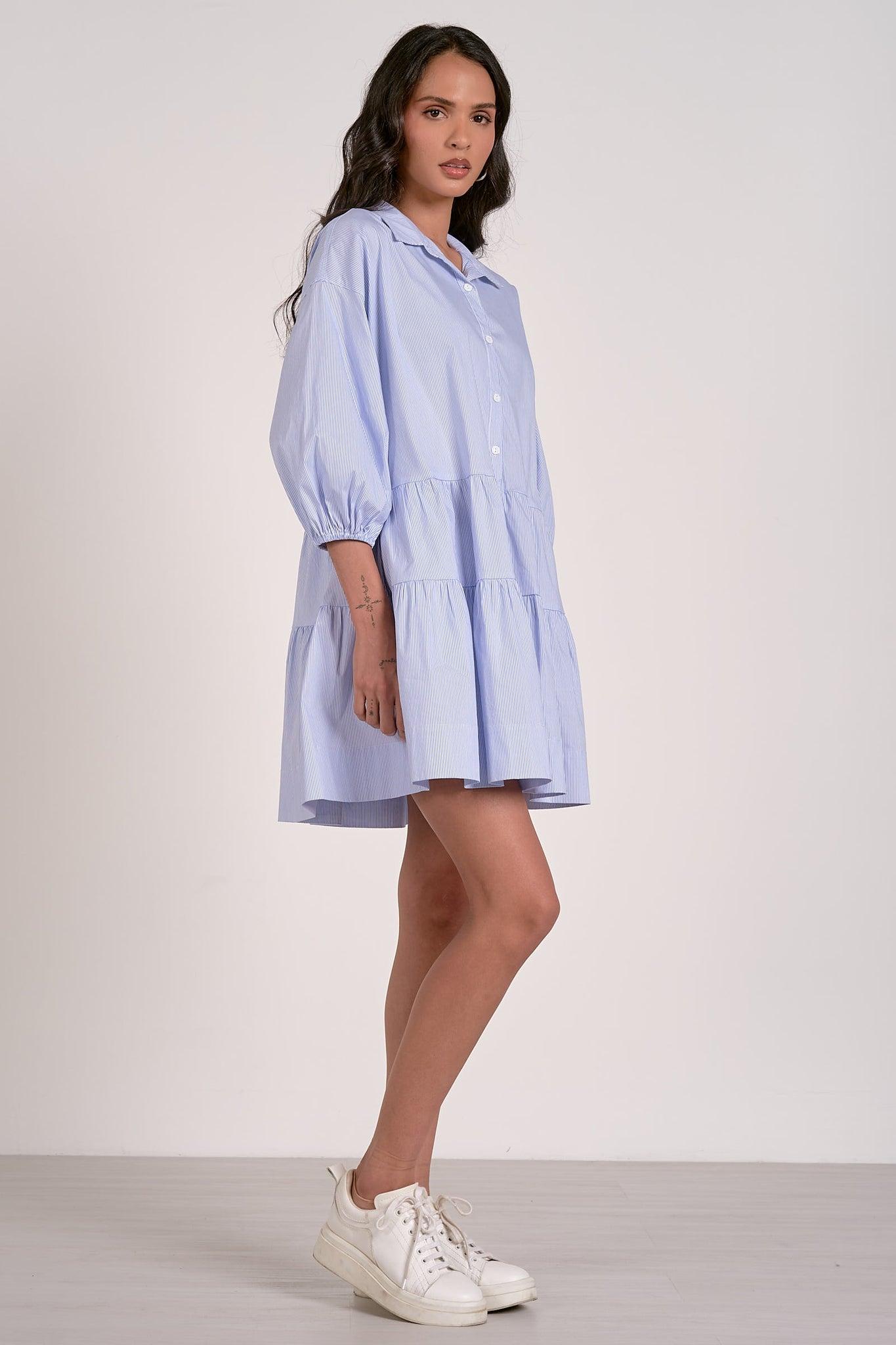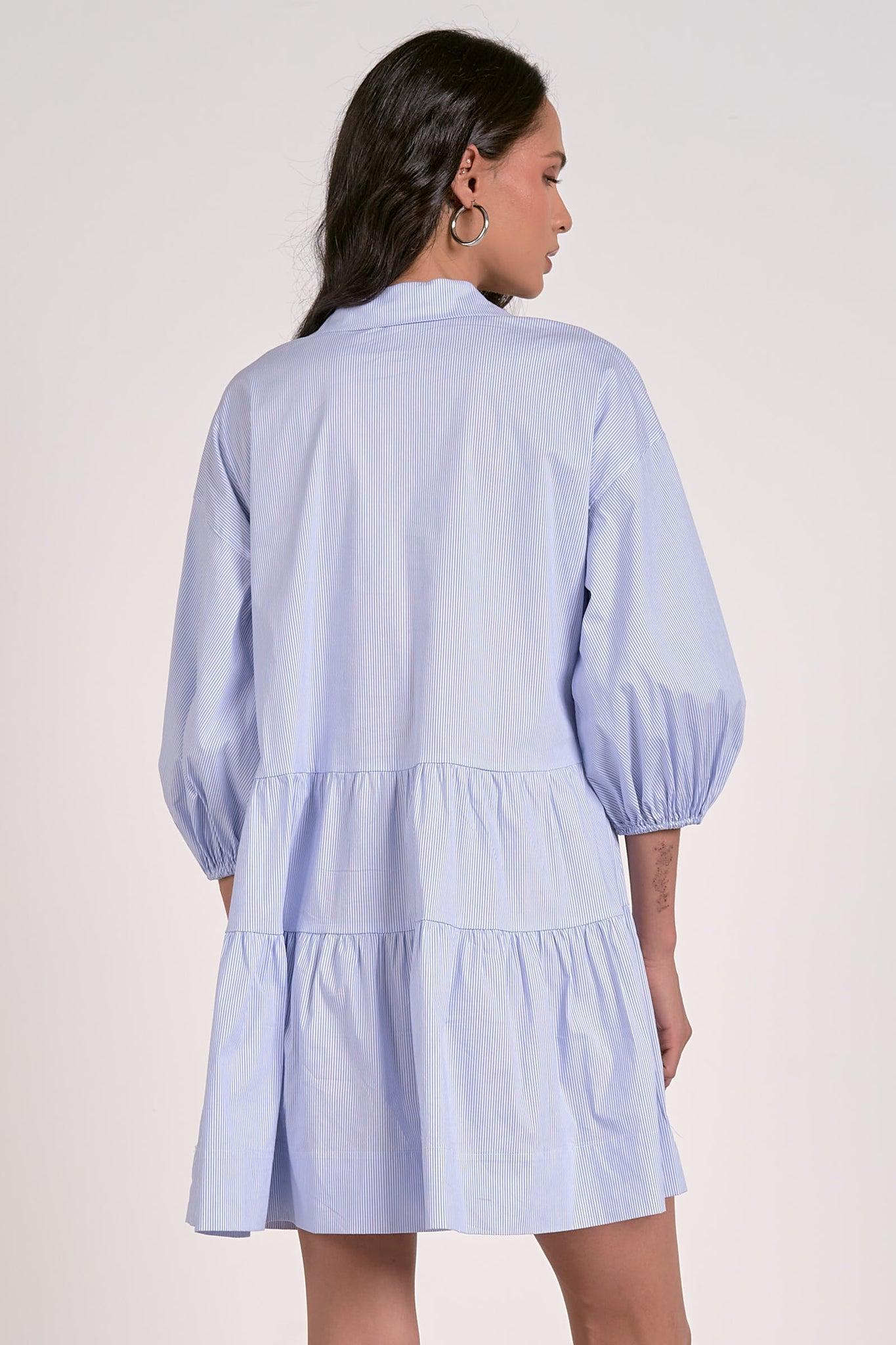 The Tiered Stripe Dress brings easy elegance with its collared neckline, 3/4 balloon sleeves, side pockets, and button-down front. The tiered design adds a playful, flowy touch, while the soft blue striped fabric gives it a fresh and timeless look—perfect for casual days or brunch outings.