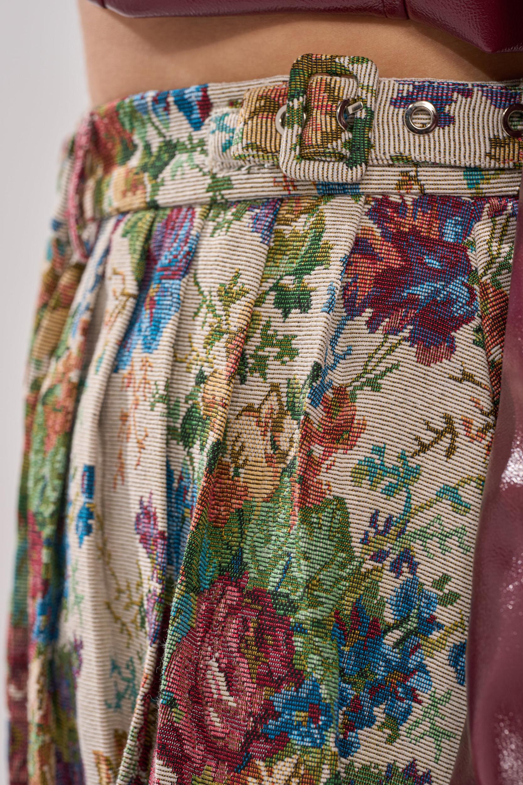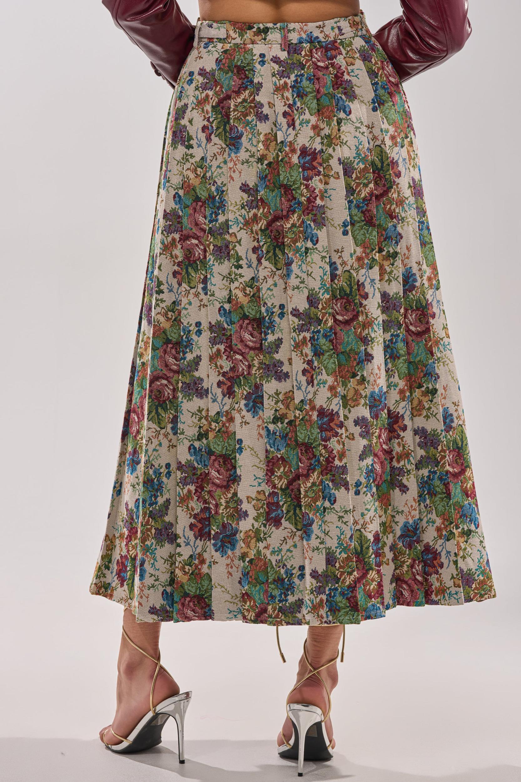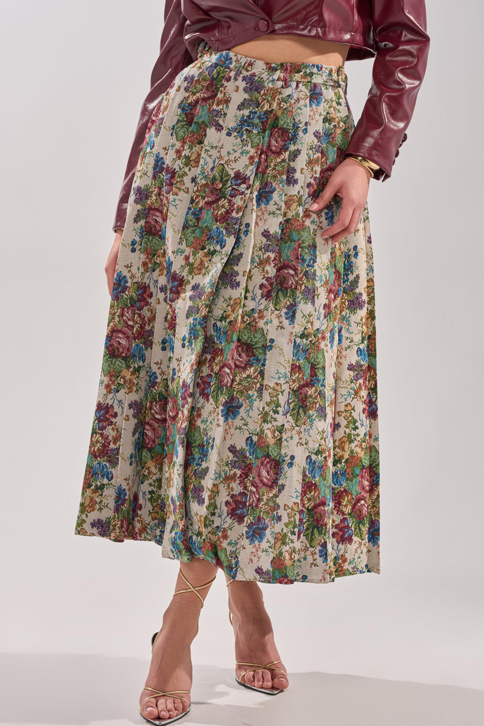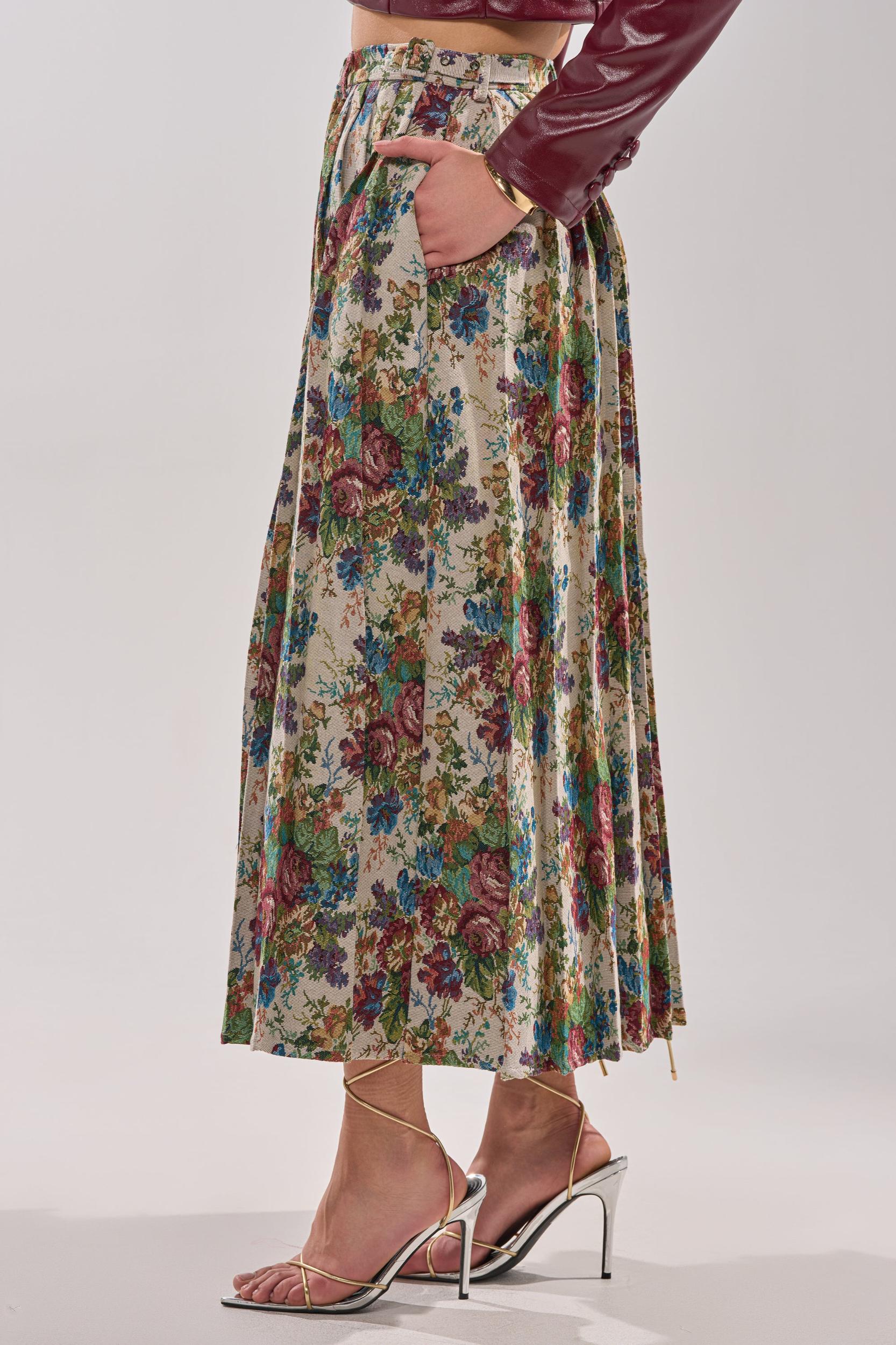 Brocade beauty! The AKIRA Label Tiffany Brocade Maxi Skirt boasts elegance and flare with its rich tapestry-style rose print in earthy tones of burgundy, green, and blue. Designed with a flattering high waist, pleats that add movement and texture, charming button-front detailing, belt loops and side belt accents, and a softly flared silhouette, this skirt blends classic femininity with effortless everyday style. Pair with a cropped white tee and a bold sneaker for the perfect match of streetwear with feminine style. - 100% Polyester- Hand Wash or Dry Clean- No Stretch- Imported (all measurements are approximate from size small)- 35” Waist to Hem- Model is 5’9.5” and wearing size smallProduct ID: 1070229 (all measurements are approximate from size 1X)- 38” Waist to HemProduct ID: 1070233