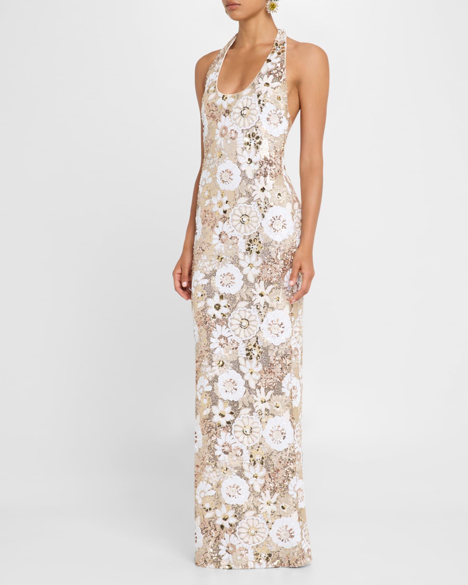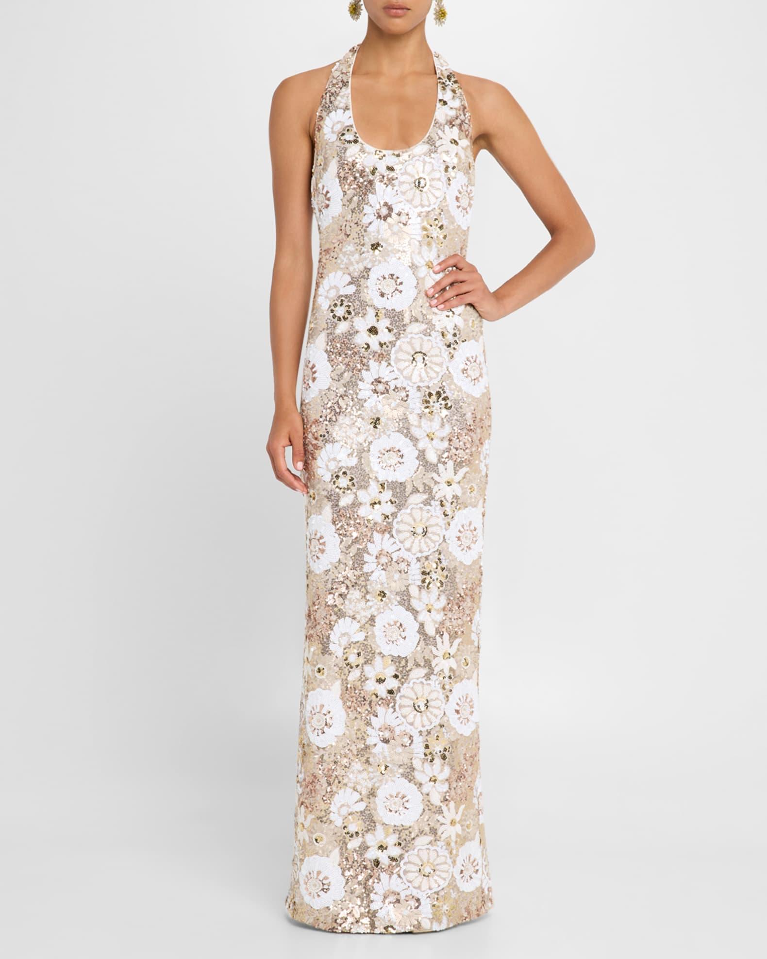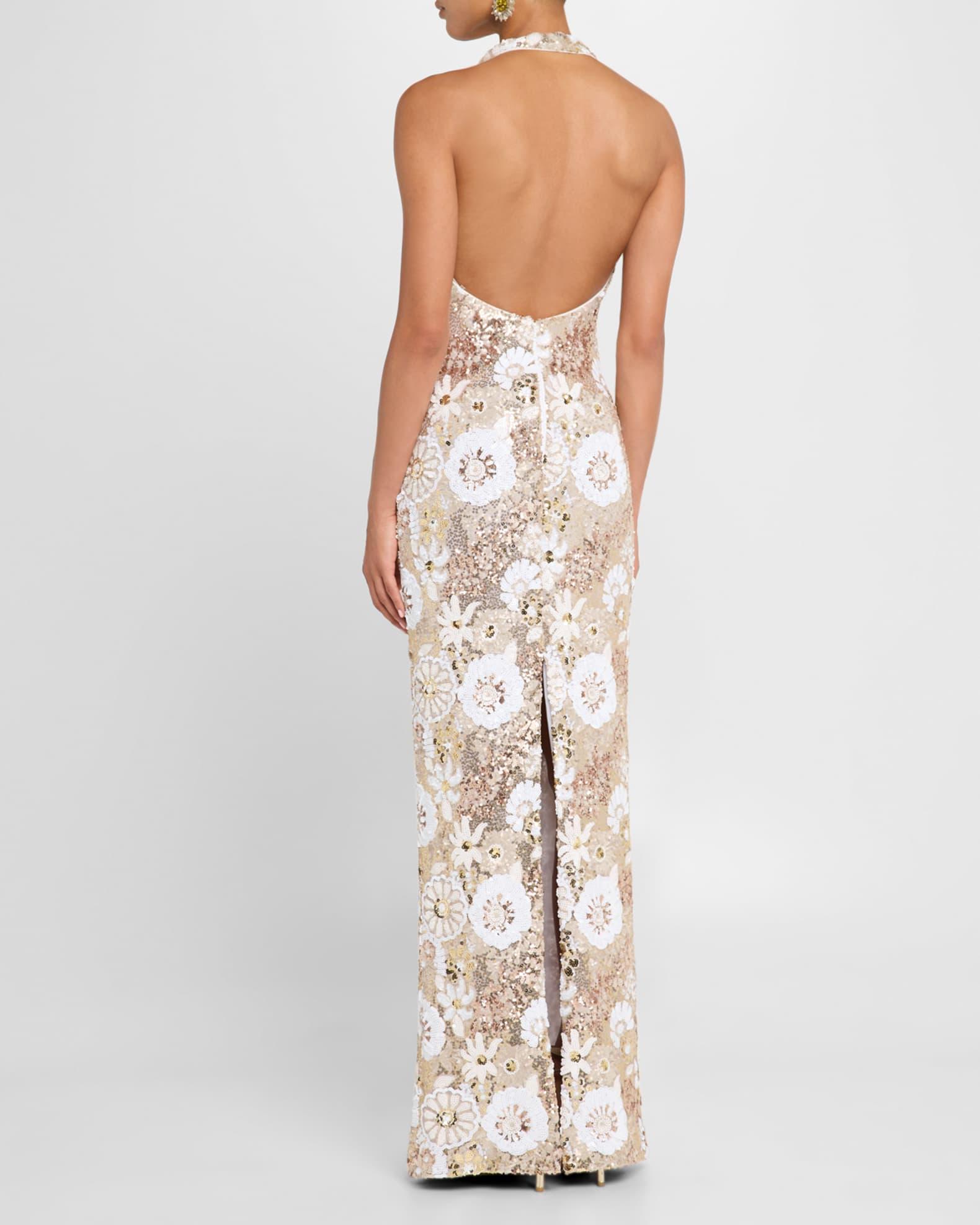 Ramy Brook "Tiffany" gown shimmers all over with sequin florals Approx. 63"L from shoulder to hem Halter neckline Sleeveless Low-cut back Center back slit Full length Column silhouette Invisible back zipper Polyester/spandex Lining: Polyester/spandex Dry clean Imported