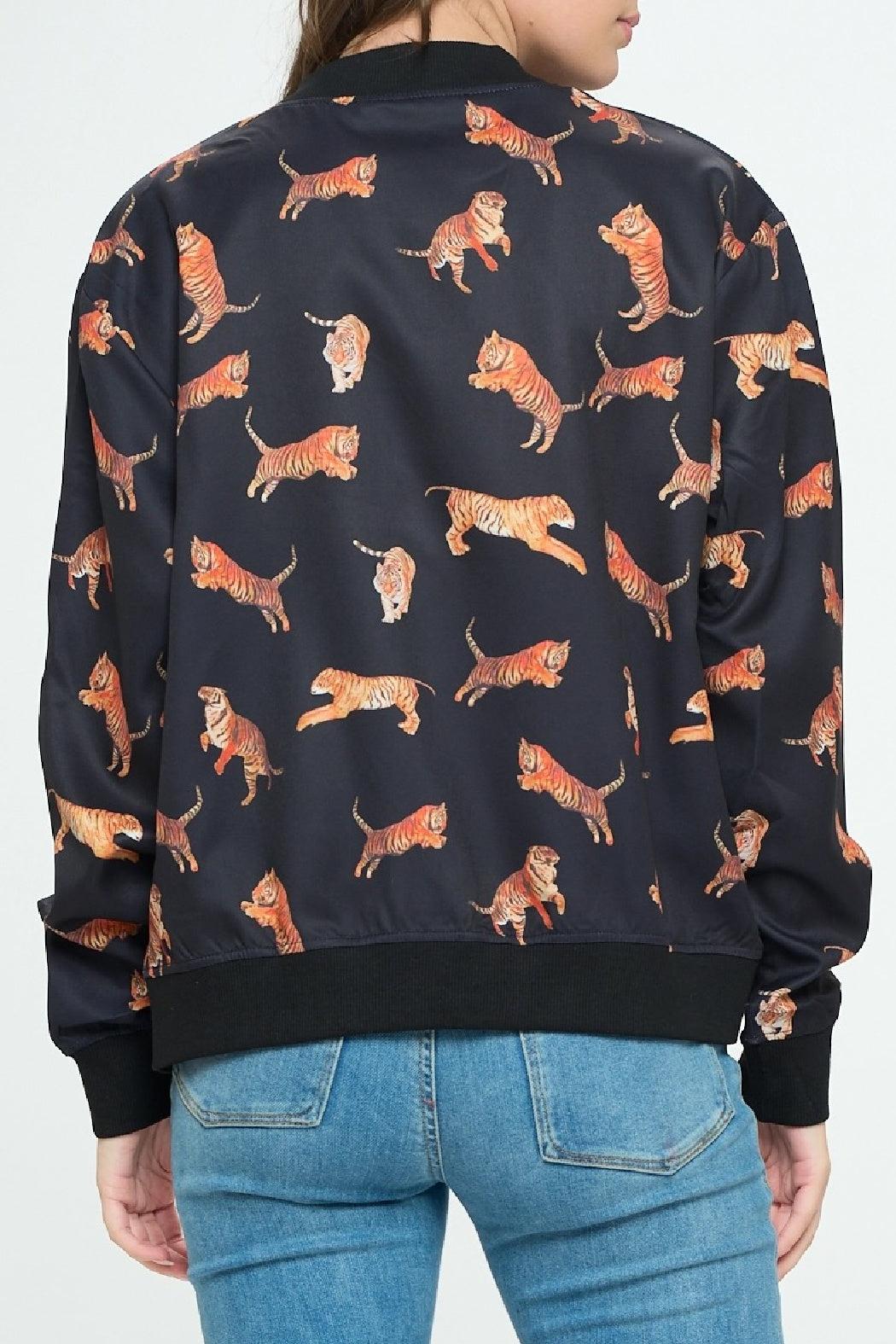 Lightweight, bomber style jacket has a tiger print throughout and pockets at the sides. Jacket is soft, comfortable and has a silky like feel. It has a full length zipper up the front and ribbed cuffing at the collar, wrists, and hemline.