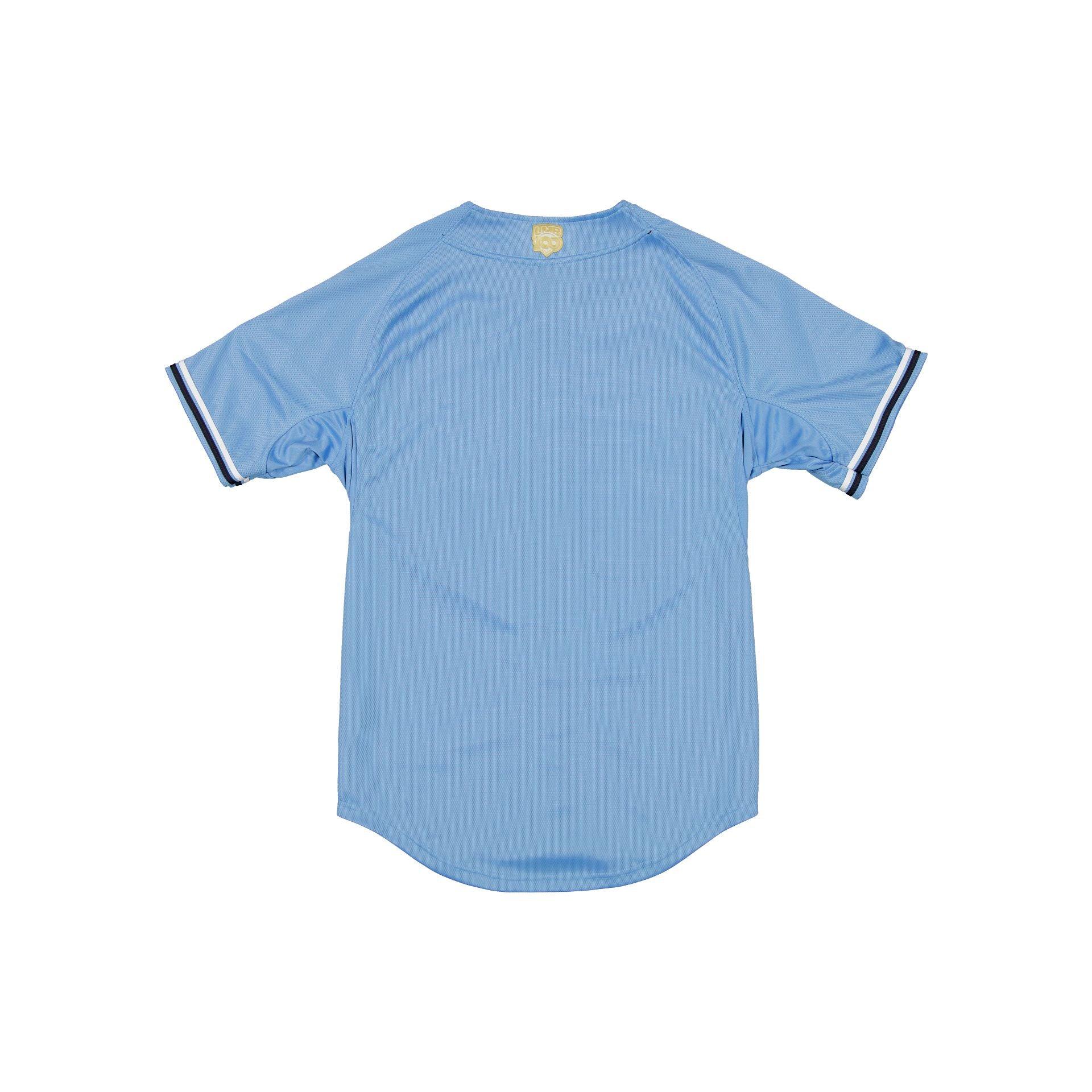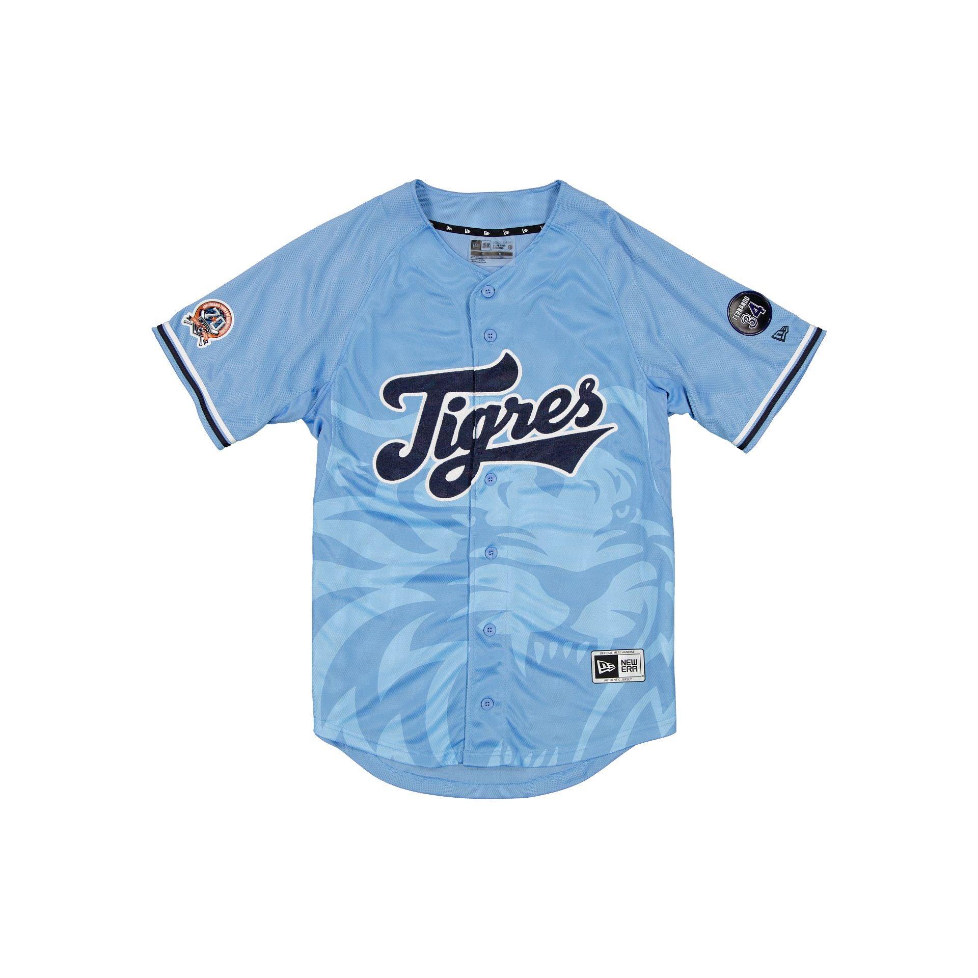 The Tigres de Quintana Roo LMB 100th Anniversary Blue Alt Jersey features an embroidered Tigres wordmark at the chest with a New Era Official Merchandise patch at the front hemline and a 70th Aniversário team patch at the right sleeve. Additional details include a Fernando 34 patch at the left sleeve and a LMB 100th Anniversary logo at the rear.Fabric: 100% Polyester