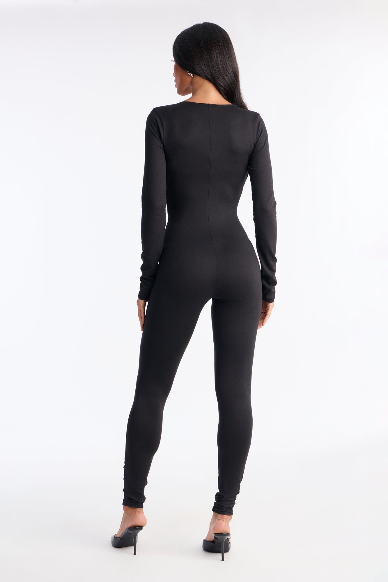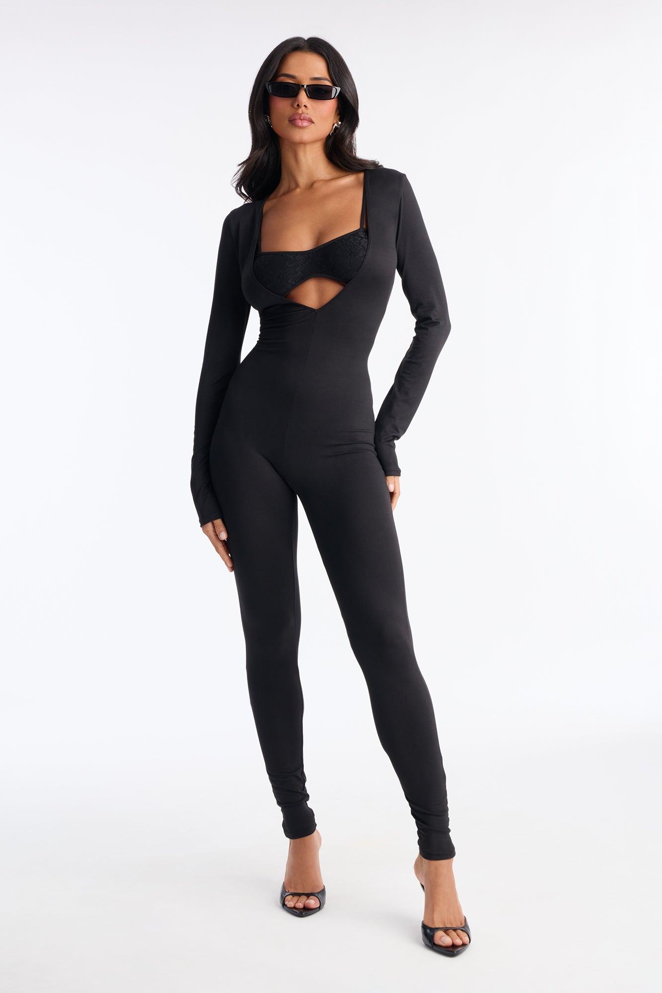 Available In Black. Catsuit And Bralette 2 Piece Set Stretch Long Sleeve Skinny Leg Lace Bralette 30" Inseam Bralette Self: 90% Nylon 10% Spandex Catsuit Self: 95% Polyester 5% Spandex Bralette Lining: 100% Polyester Imported California Proposition 65WARNING: Cancer and Reproductive Harm - www.P65Warnings.ca.gov.