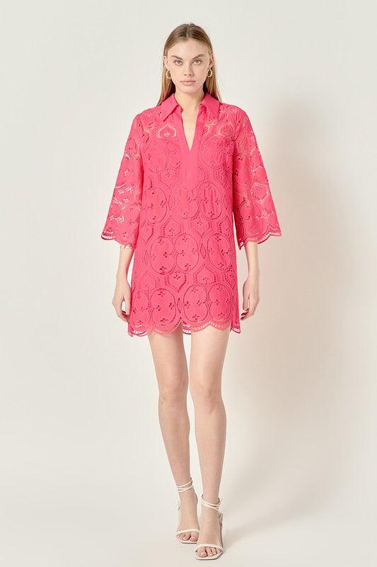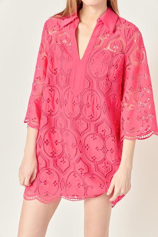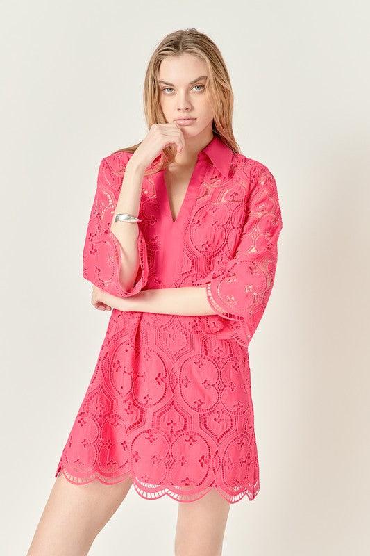 Elevate your wardrobe with our Tilly Lace Shirt Dress in vibrant hot pink. This sophisticated piece features delicate lace detailing with a comfortable lining to ensure both style and practicality. The shirt dress silhouette offers versatile styling options for both professional settings and special occasions.