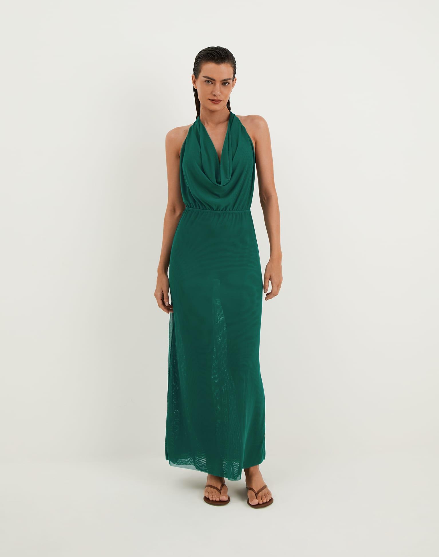 The ViX Tilly Long Cover Up is a sleeveless maxi-style cover up dress with a draped cowl neckline, open back, dual side slits and tie closures at the neck. Style the Tilly Long Cover up with a matching swimsuit and sandals for a vacation-ready look. Features: Sleeveless Unlined Draped cowl neckline Open back Tie closur