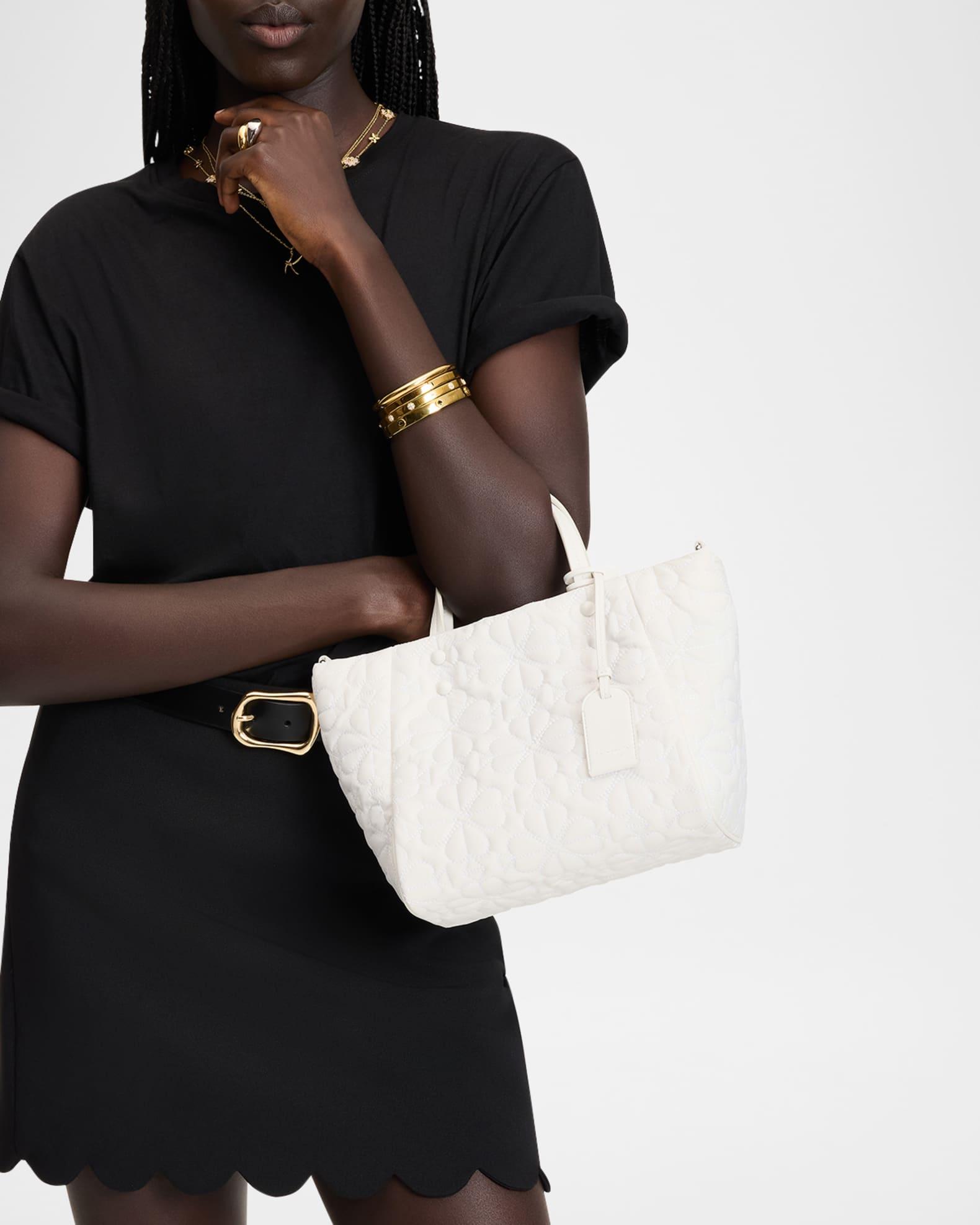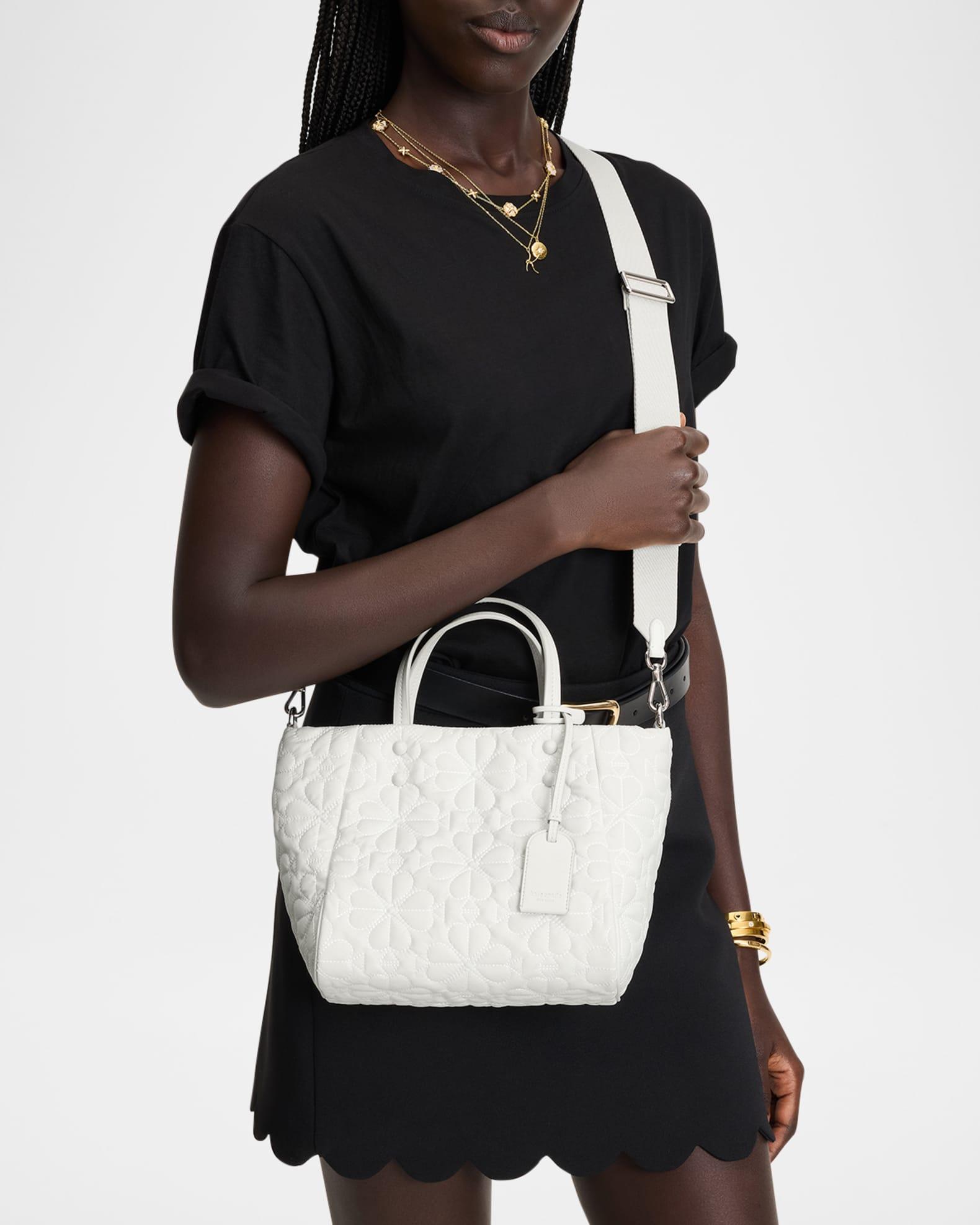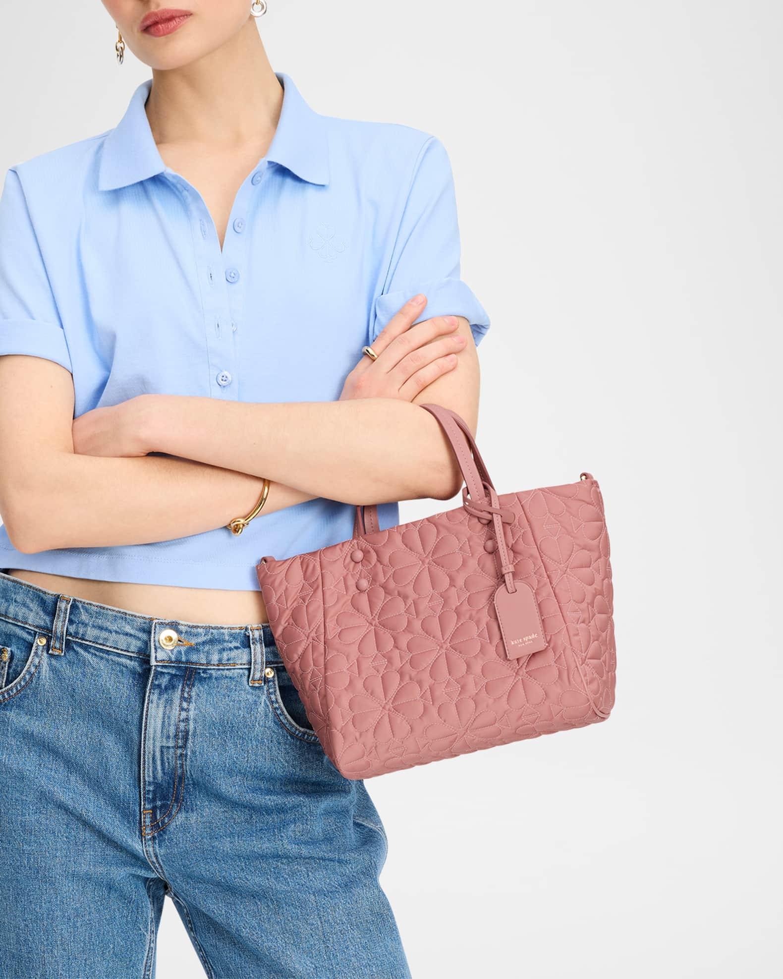 kate spade new york "Tilly" tote bag in flower quilted fabric and leather Top handles with logo tag Detachable, adjustable web crossbody strap Open top with magnetic closure Interior, one zip pocket Lining: Polyester Approx. 12"H x 8.4"W x 4.7"D Polyester/polyurethane Item Weight (Lbs.): 1.0 Spot clean Imported