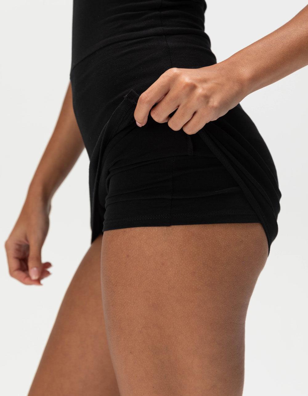 BLACK. Tilly's Skort Mini Dress. It looks like a cute little black dress but don't be fooled, this LBD comes with shorts sewn in at the waist. Move comfortably day and night knowing you have a little extra coverage. Square neckline with tank style straps. Mini side slits on each side. 96% Cotton, 4% Spandex. Hand wash. Imported.