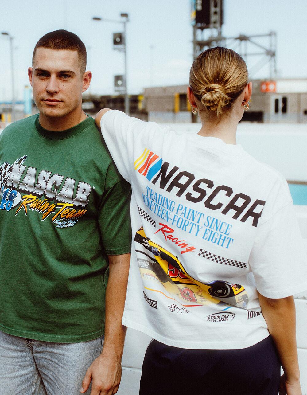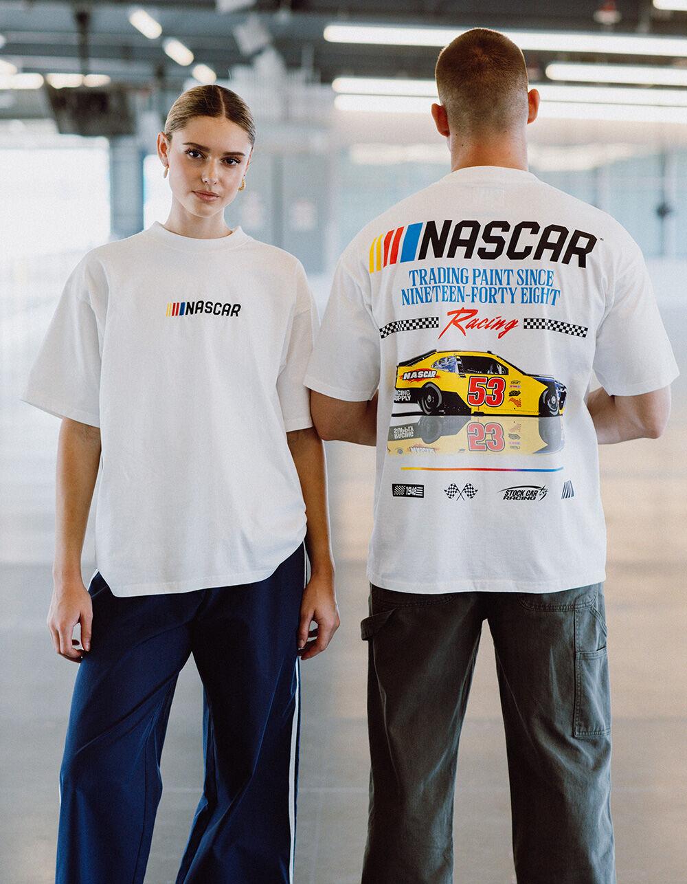 TILLYS EXCLUSIVE COLLECTION Tillys x NASCAR Trading Paint Boxy Tee. NASCAR embroidery at chest. Large graphic screened on back. Boxy fit. Crew neck. Short sleeve. 100% Cotton. Machine wash. Imported.