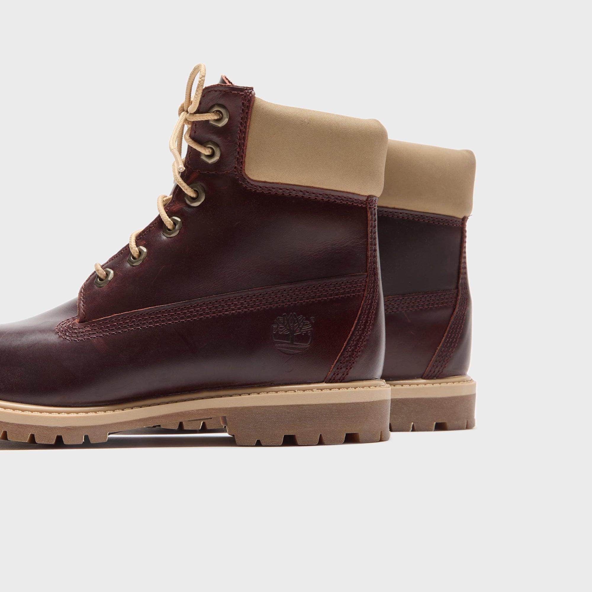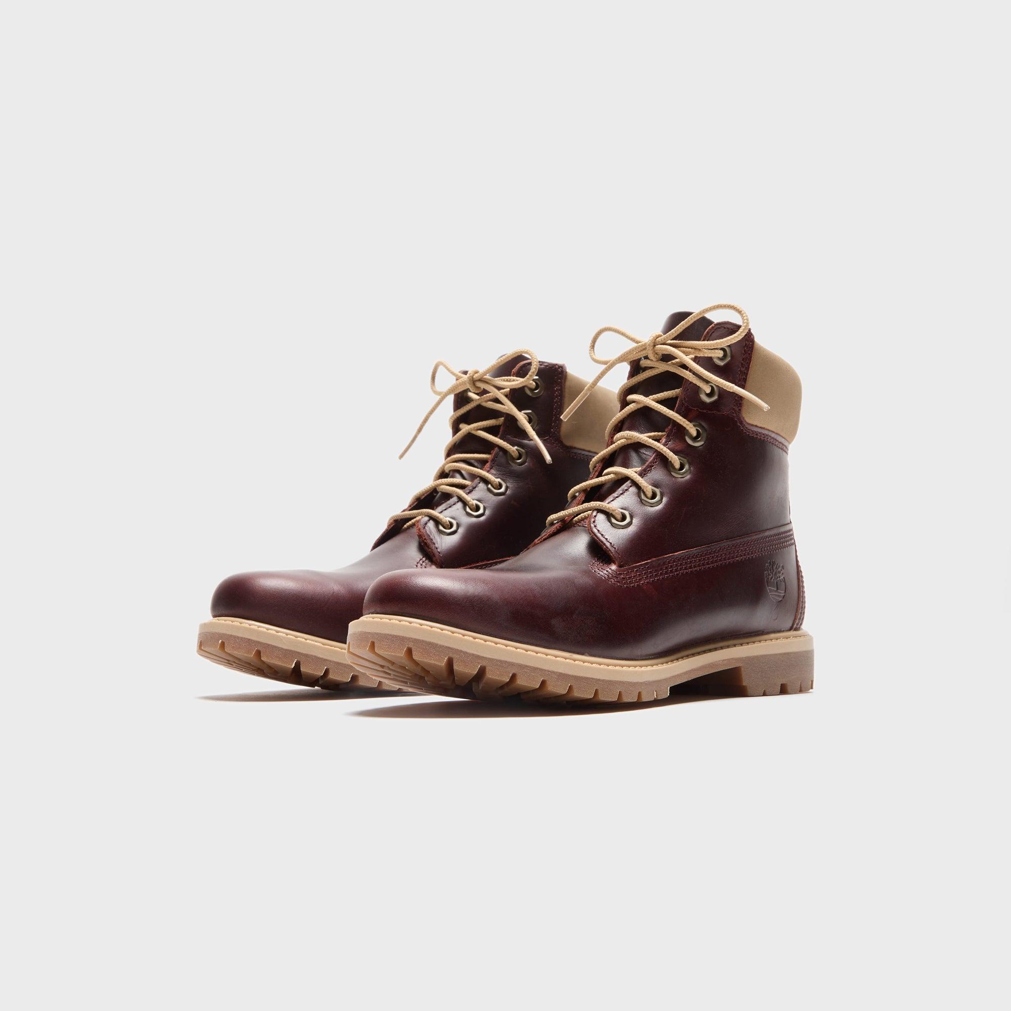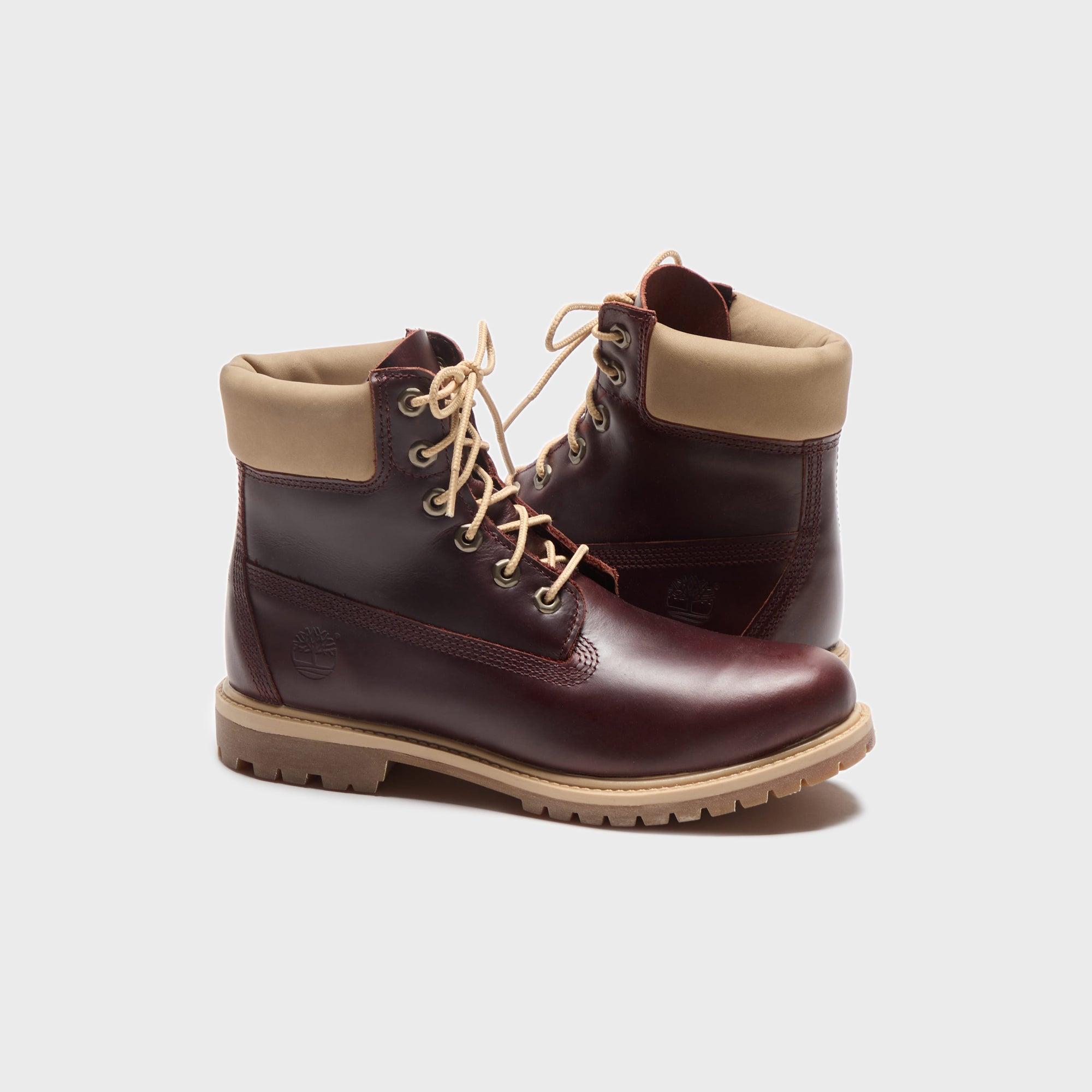 Premium 6-Inch Lace Up Boot silhouette Leather upper Padded suede collar Timberland logo on ankle Metal eyelets Steel shank for arch support TPR welt Seam-sealed construction Round laces EVA footbed Rubber lug outsole Style: tb0a2hr8eiw1 Color: Burgundy Material: Leather