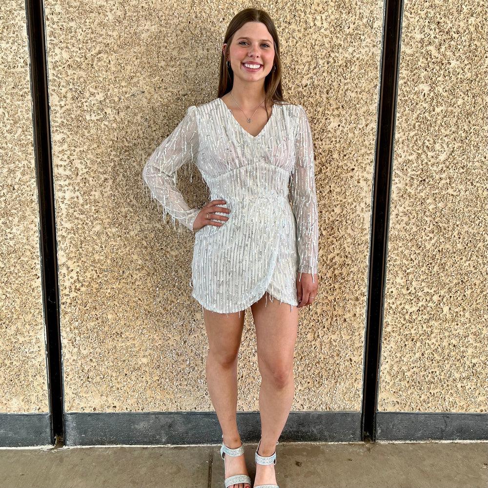 Look glamorous in our Time Square Party Dress. Crafted with a vneck and finished with shimmering silver sequins, this long sleeve mini dress is just what you...