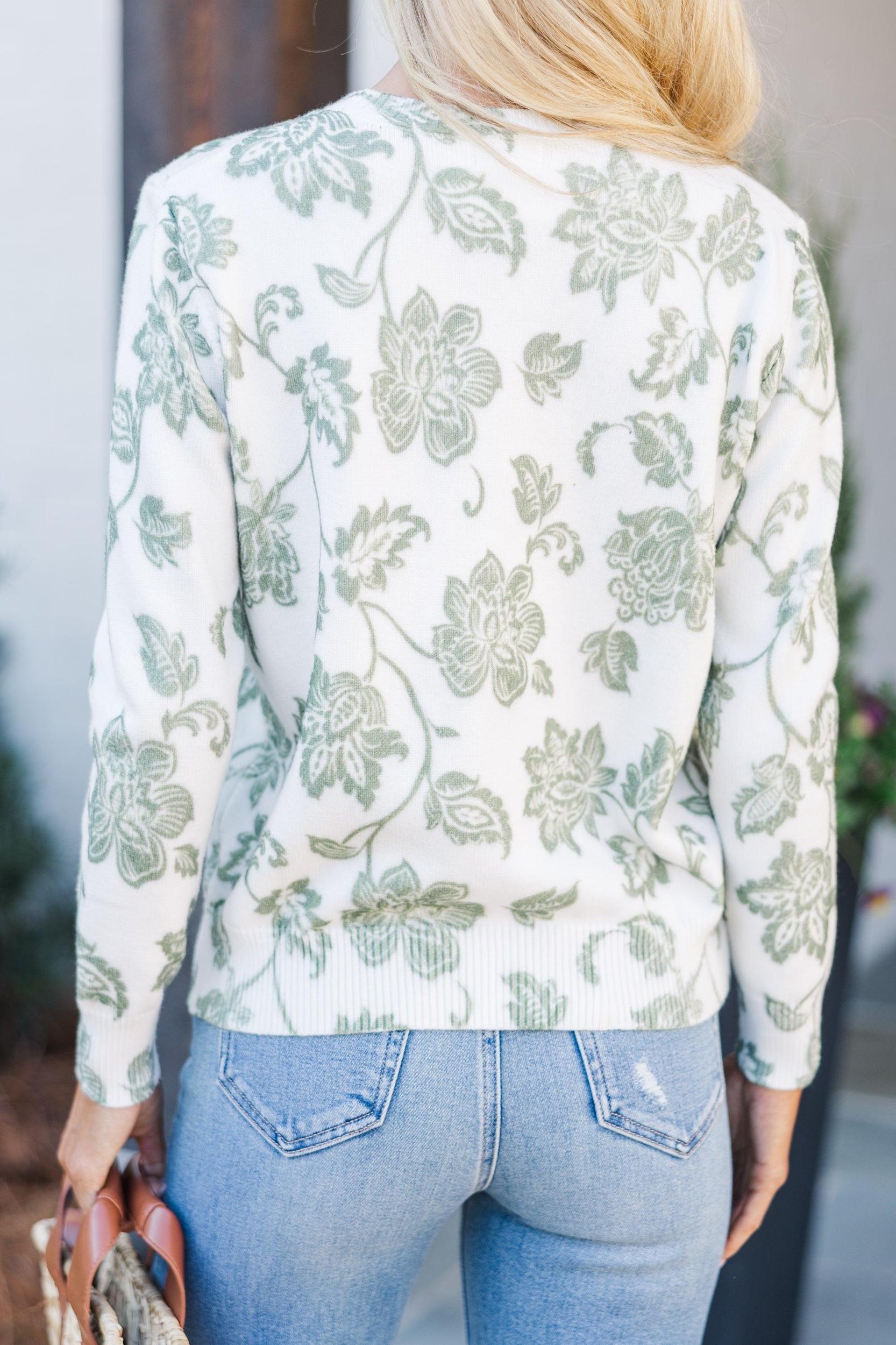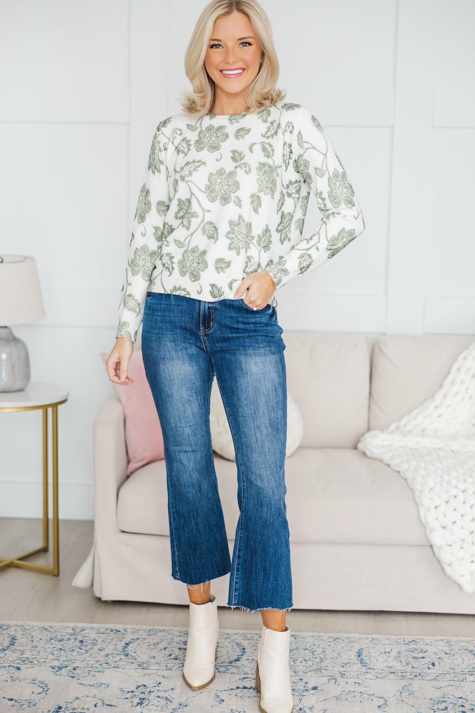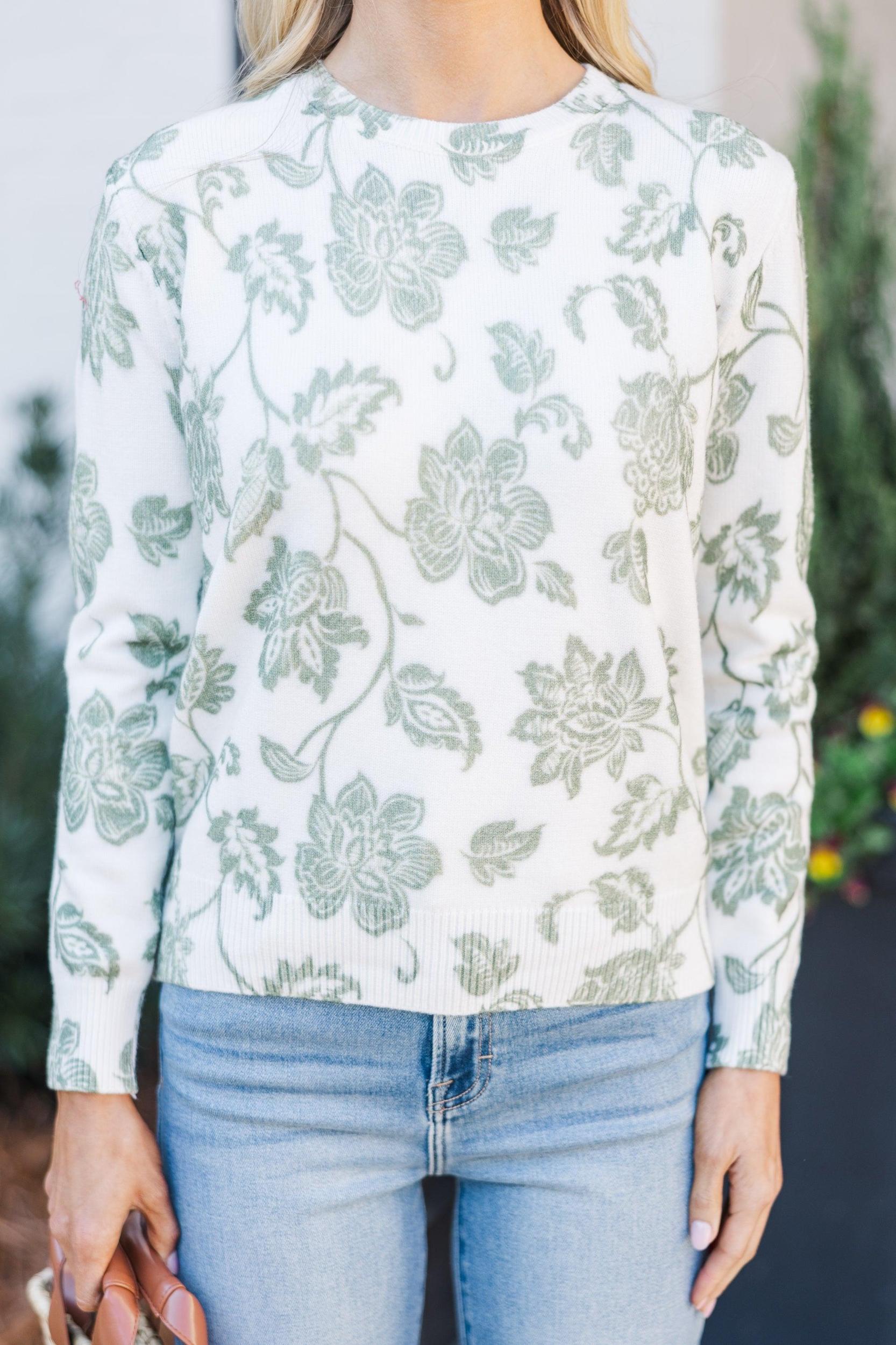 Cozy up in effortless elegance with this chic sweater! This dreamy knit features a delicate floral toile pattern on a soft ivory base, creating a timelessly chic look. The relaxed fit, ribbed cuffs, and hem offer the perfect blend of comfort and sophistication, making it an easy go-to for chilly days. Pair it with your favorite denim for a polished yet cozy everyday outfit! Classic round neckline Long sleeves Feminine floral toile pattern Material as a generous amount of stretch Payton is wearing the small.