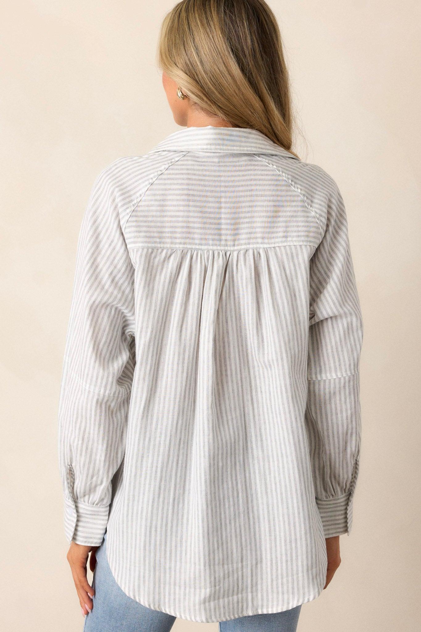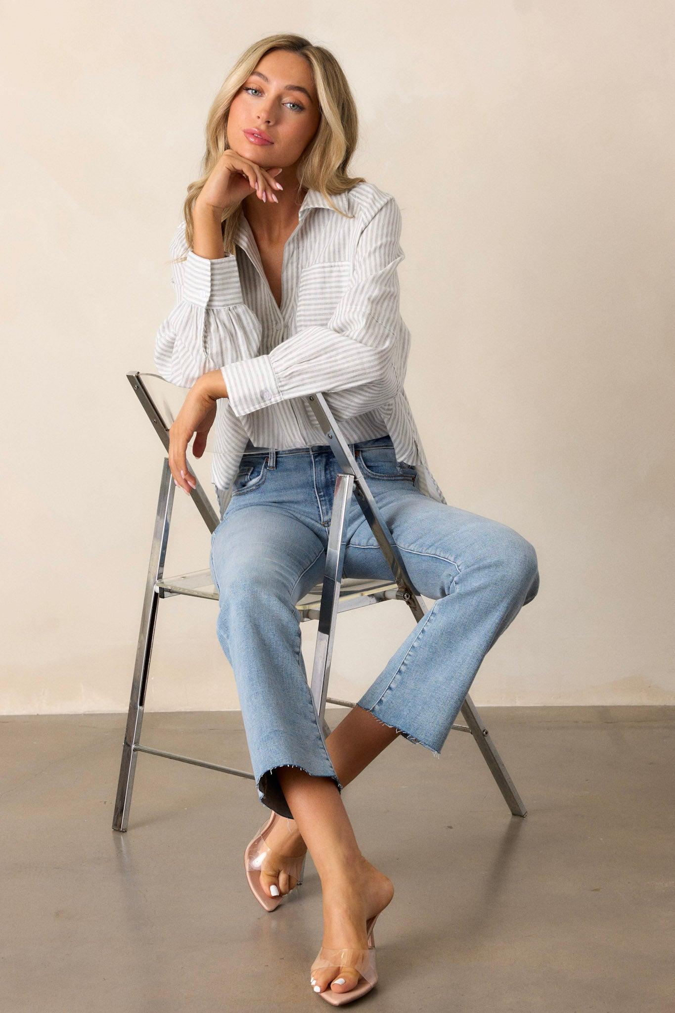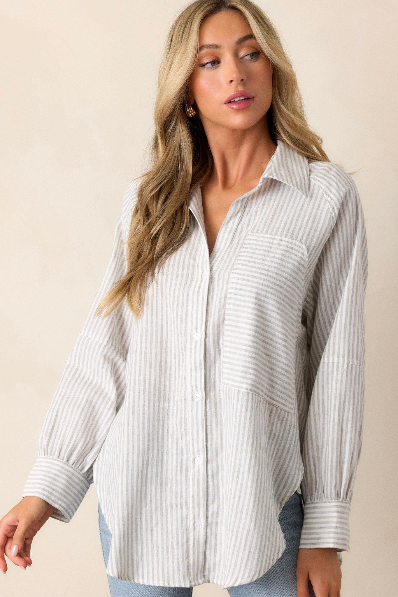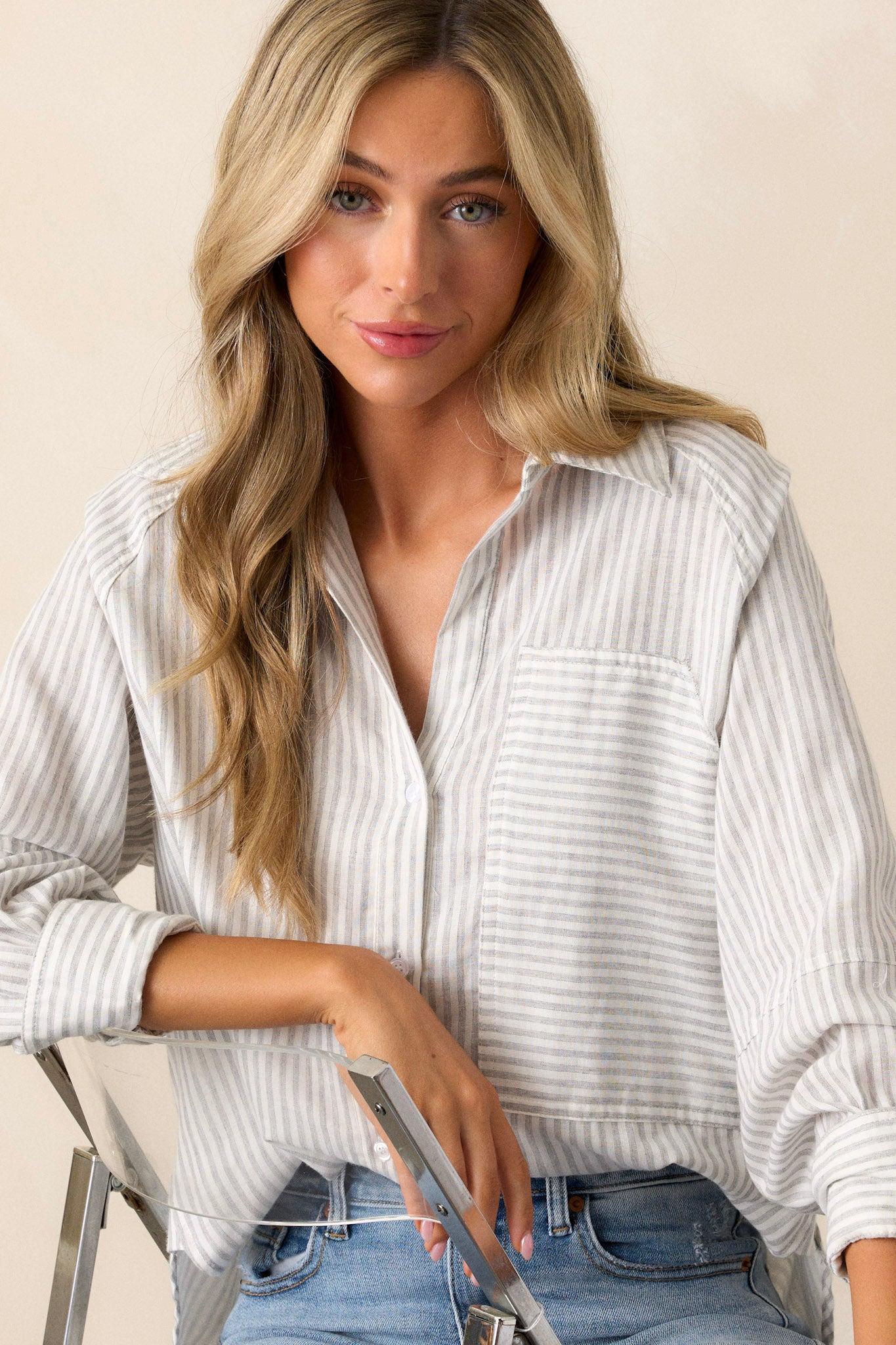 Stay comfortable and chic with our Timeless Flow 100% Cotton Grey Button Front Top. This grey top features a classic button-up design and a stylish collar, perfect for any occasion. Dress up with some work pants, while dressing down with some sneakers. Keep your style fresh and effortless with this versatile piece. This top features a functional button front, cuffed long sleeves, a collared neckline, and skinny grey vertical stripes. 100% Cotton Hand Wash Cold Designed in USA Manufactured in China Model is wearing a size Small