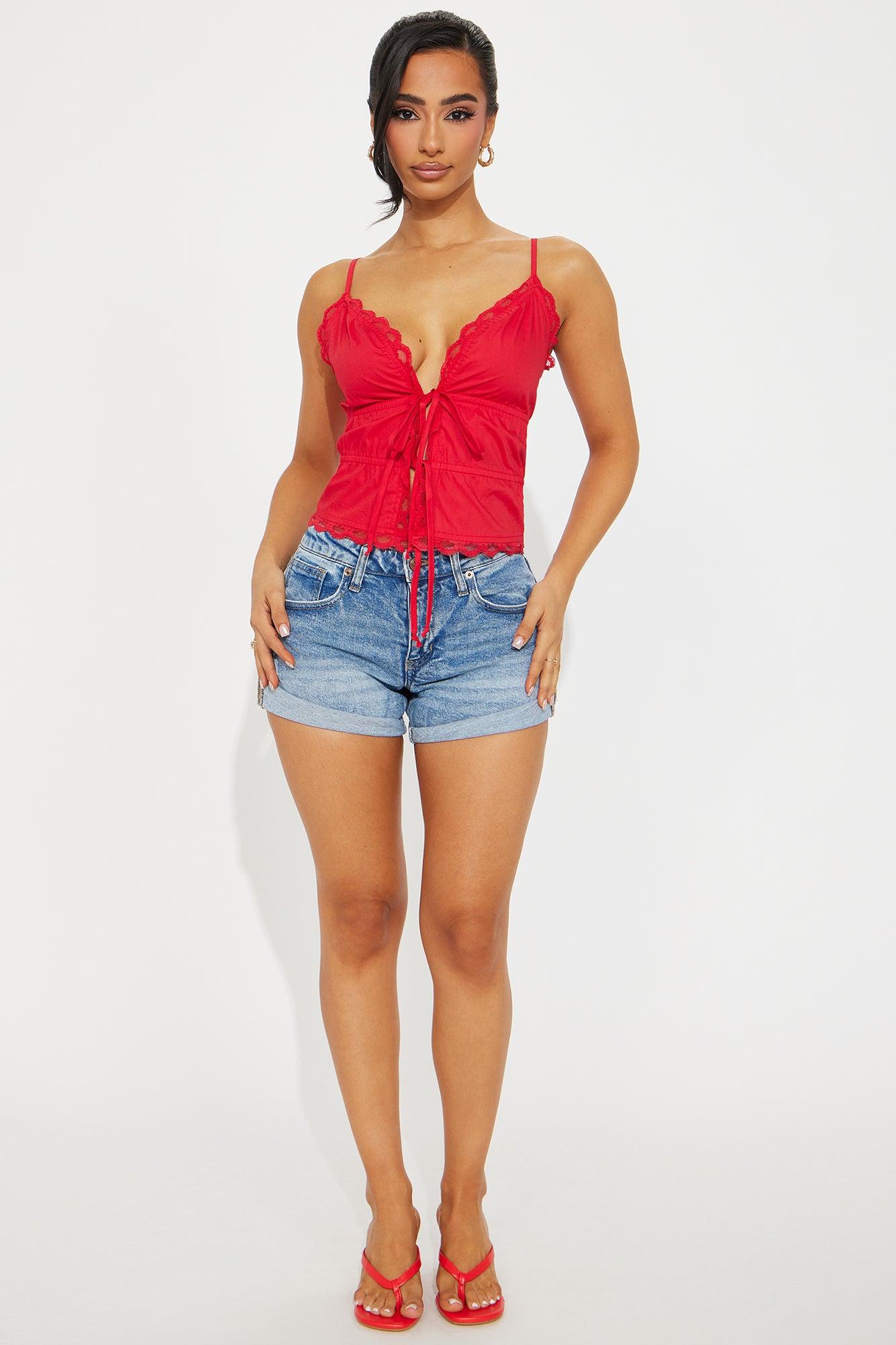Available In Off White And Red. Poplin Top Non Stretch Adjustable Spaghetti Straps Tie Front Lace Trim Self: 100% Cotton Contrast: 90% Nylon 10% Spandex Imported California Proposition 65WARNING: Cancer and Reproductive Harm - www.P65Warnings.ca.gov.