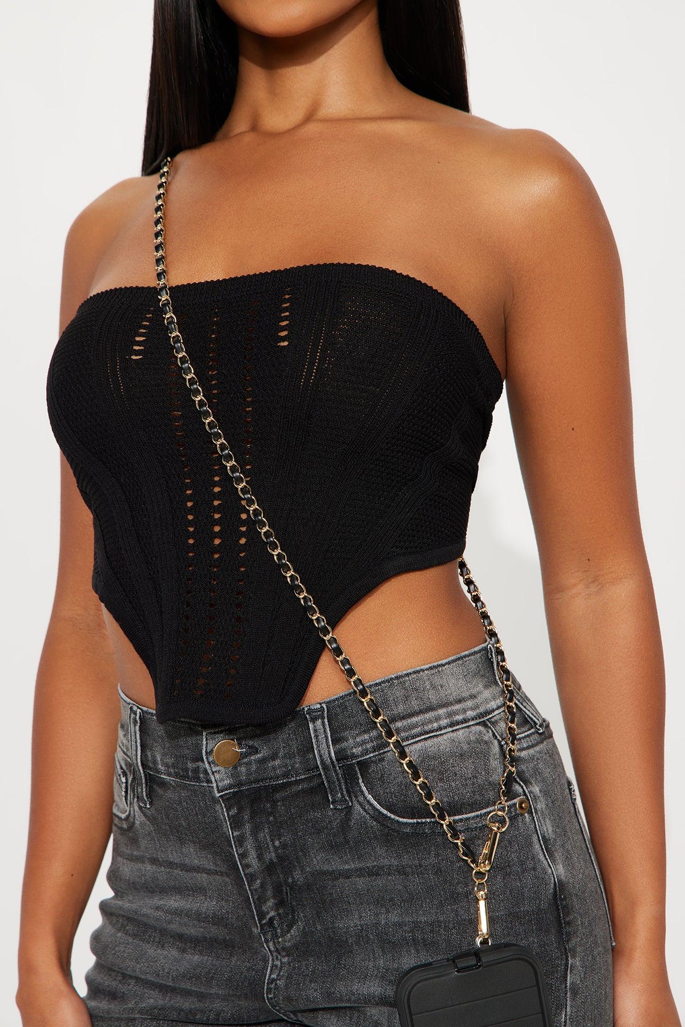 Available In Black. Phone Crossbody Chain Lobster Clasp Closure Card Insert Included 60% Iron, 40% Faux Leather Material Imported California Proposition 65WARNING: Cancer and Reproductive Harm - www.P65Warnings.ca.gov.
