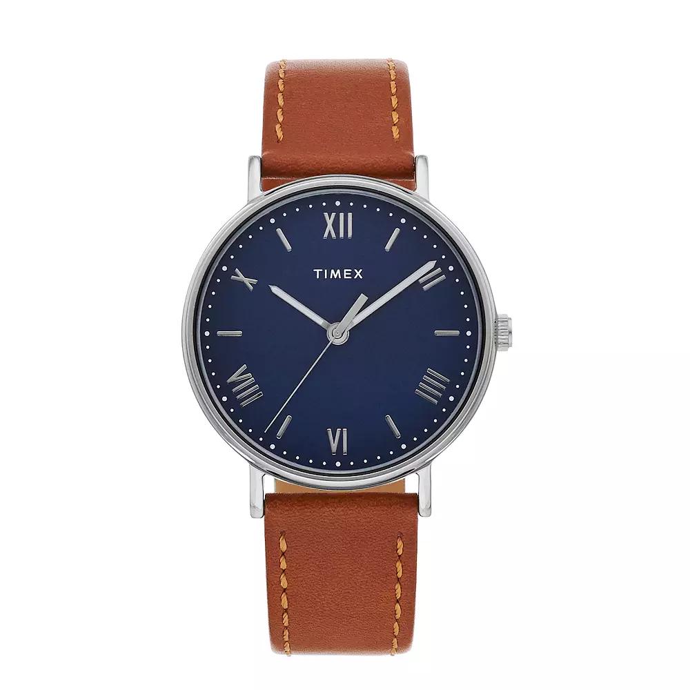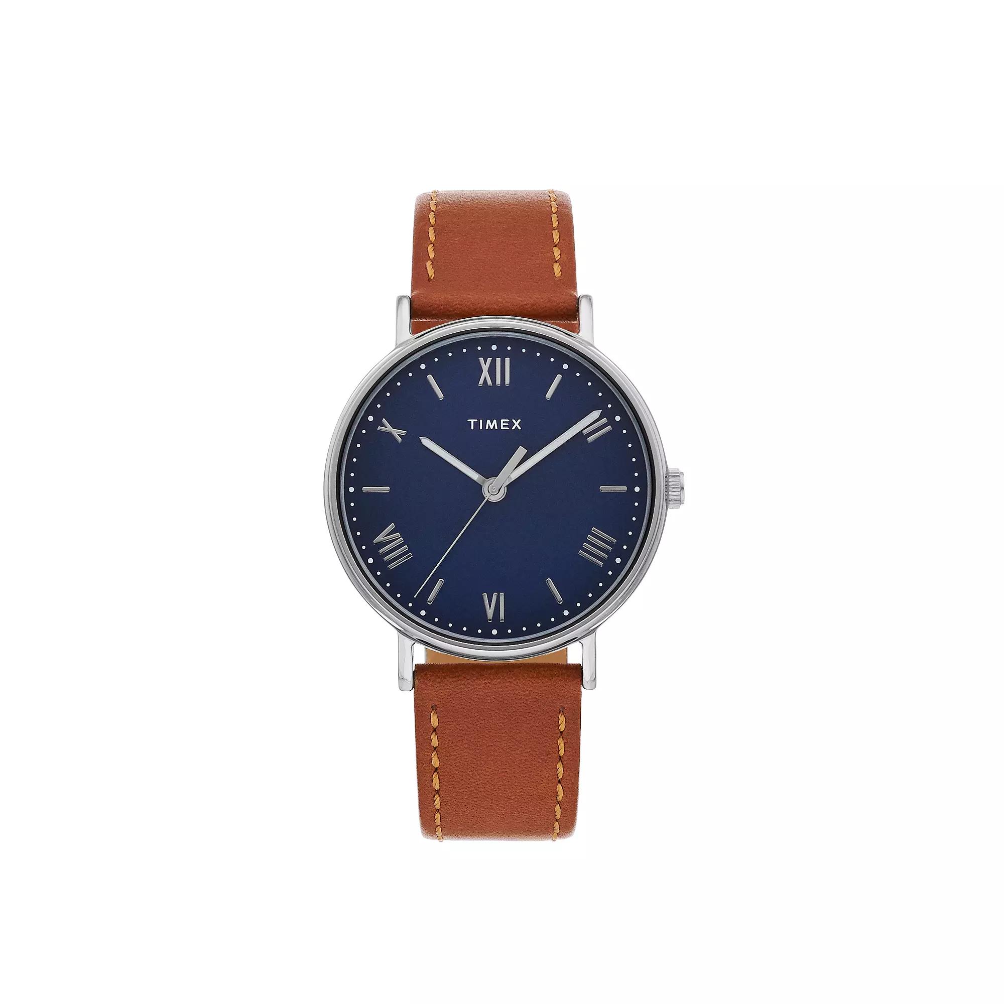 Dress up your casual looks with this men's stylish leather watch from Timex. DISPLAY Dial color: blue Illumination: Indiglo EL backlight Face cover material: mineral crystal CASE Material: silver-tone brass with stainless steel back Diameter: 41 mm BAND Material: brown leather Clasp: buckle Circumference: adjusts from 150 mm to 205 mm Width: 20 mm DETAILS Movement: quartz Power: battery Water resistance: 30 meters Packaging: boxed Warranty: manufacturer's 1-year limited For warranty information please click here Model number: TW2R63900JT Size: Large. Gender: male. Age Group: adult.