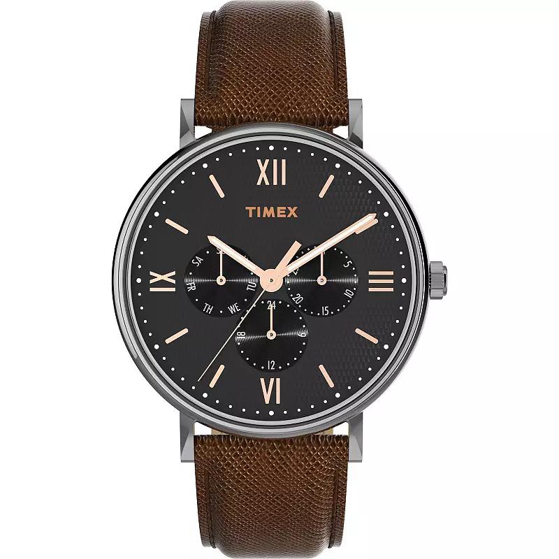 This Timex Mens Southview Leather Strap Watch offers refined style with a sleek leather strap and classic dial, making it perfect for work or casual outings. Click on this JEWELRY & WATCHES GUIDE to learn about fit, styles, materials and more! This Timex Mens Southview Leather Strap Watch offers refined style with a sleek leather strap and classic dial, making it perfect for work or casual outings. Click on this JEWELRY & WATCHES GUIDE to learn about fit, styles, materials and more! FEATURES Additional features: day & date subdialsDISPLAY Face cover material: mineral crystal Illumination: luminescent handsCASE Material: brass Caseback material: stainless steel Diameter: 41 mmBAND Band type: strap Material: leather Clasp: buckle Lug width: 20 mm Band length: 150 mm - 205 mmDETAILS Movement: quartz Power: battery Water resistance: 30 meters Packaging: boxed Manufacturers 1-year limited warranty: For warranty information please click here Size: 41MM. Color: Brown. Gender: male. Age Group: adult.