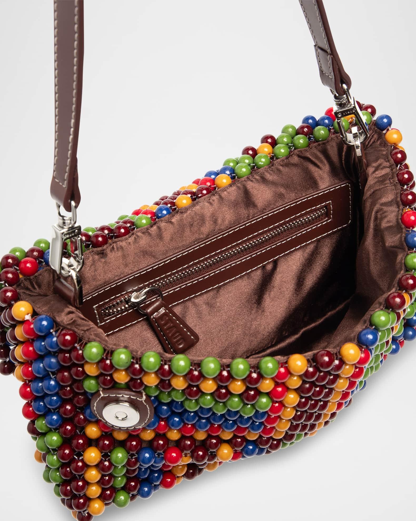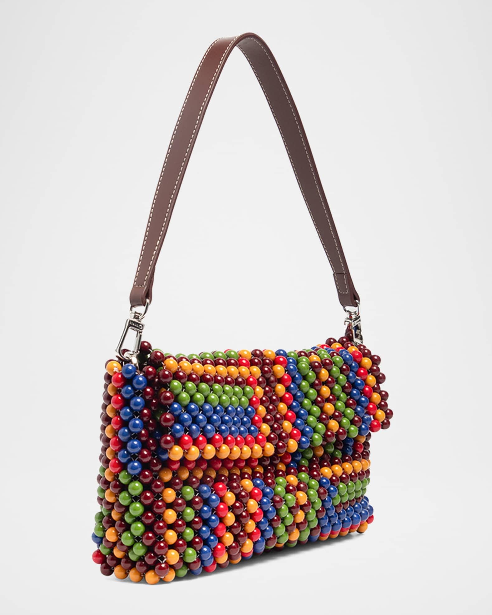 STAUD "Timmy" convertible shoulder bag in beaded fabric and leather Detachable shoulder strap, 8.5" drop Can be worn as a clutch or shoulder bag Flap top with magnetic closure Interior, one zip pocket Approx. 6.3"H x 10"W x 2"D Modacrylic Spot clean Imported