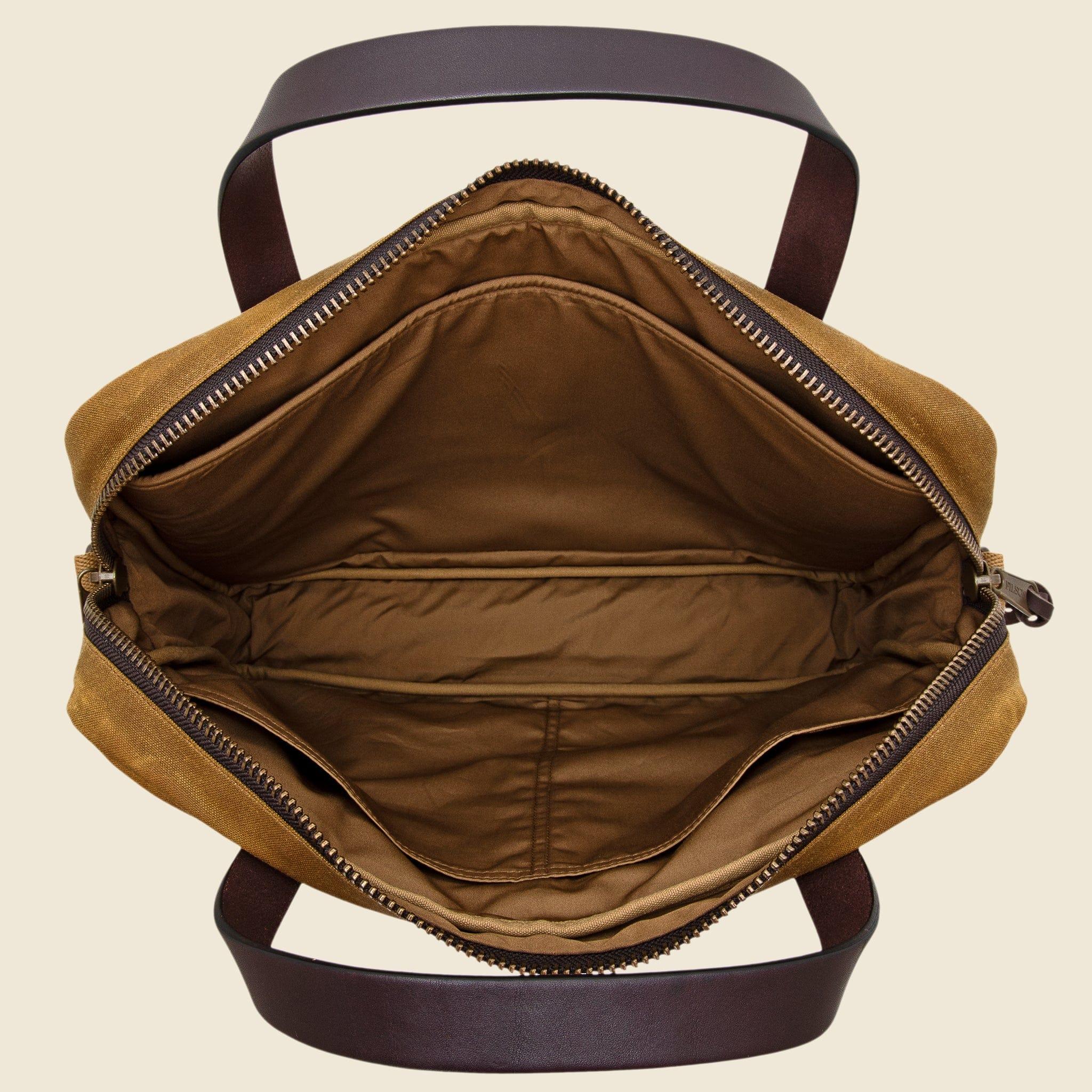 The Tin Cloth Compact Briefcase from Filson is made from durable, weather-resistant waxed canvas produced by the leaders in waxed textile production, British Millerain to provide decades of protection from the elements. Its padded laptop sleeve fits any laptop or tablet up to 15” and the front stow pocket extends the full width of the briefcase to carry any essential documents or cables needed to make light work of any task. Made with durable Tin Cloth waxed cotton Padding protects a 15” laptop Fully lined with cover cloth Metal YKK® zipper Front stow pocket Snap-secure back pocket Cotton webbing removable shoulder strap Materials: 100% cotton, 14oz | Lining: 100% cotton, 6oz | Straps: Bridle leather, EVA foam, cotton webbing Dimensions: Length: 15” | Width: 2 ¾” | Height: 11 ½”