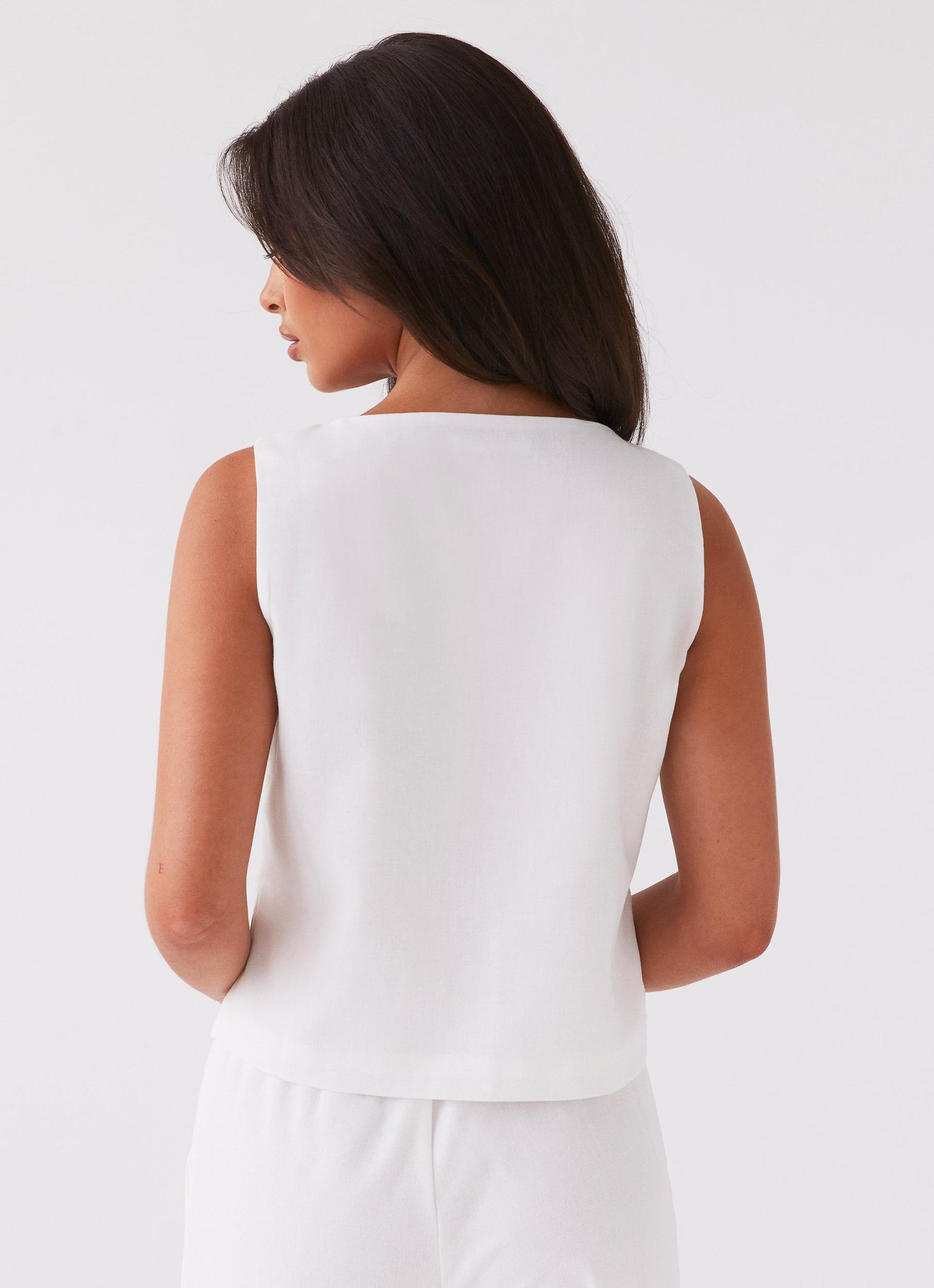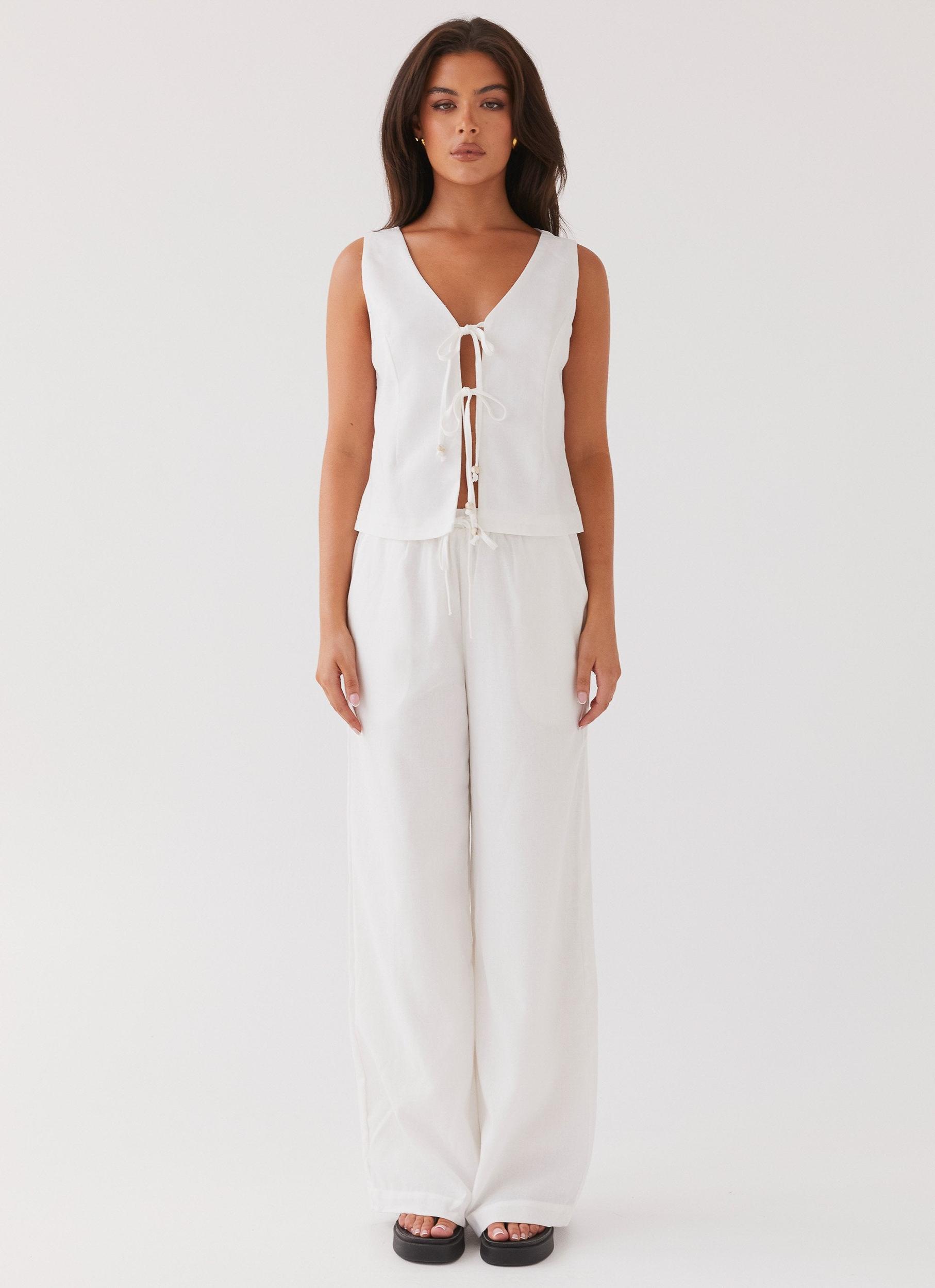 Peppermayo Exclusive The Tina Linen Vest Top – a chic essential for your wardrobe. Made from premium linen, it features a flattering v-neckline and front tie closures for added style. Effortlessly versatile, it's perfect for any occasion, from casual outings to evening affairs. - Vest top- Lined- Tie closures- Sleeveless- V-neckline- 45% Linen, 55% Cotton Size US 4 measurements:Waist 92cmLength 51cmBust 96cm Olivia wears size US 2 (X-Small or AU 6 equivalent)