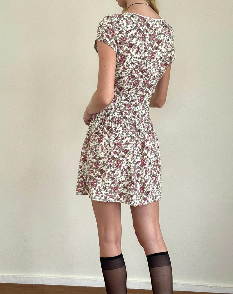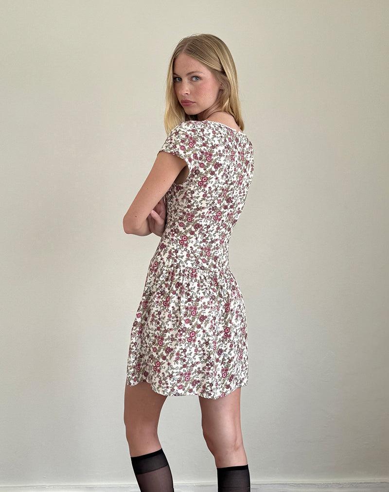 Our Tipani mini dress in a vintage bloom ivory, gives you all the ditsy floral you need this season, features a scoop neckline, short sleeves, and dropped V waistline with gathers to create a flowy skirt. Complete with picot trim along the neckline. MODEL WEARS SIZE: EXTRA SMALL - MODEL HEIGHT:5'7