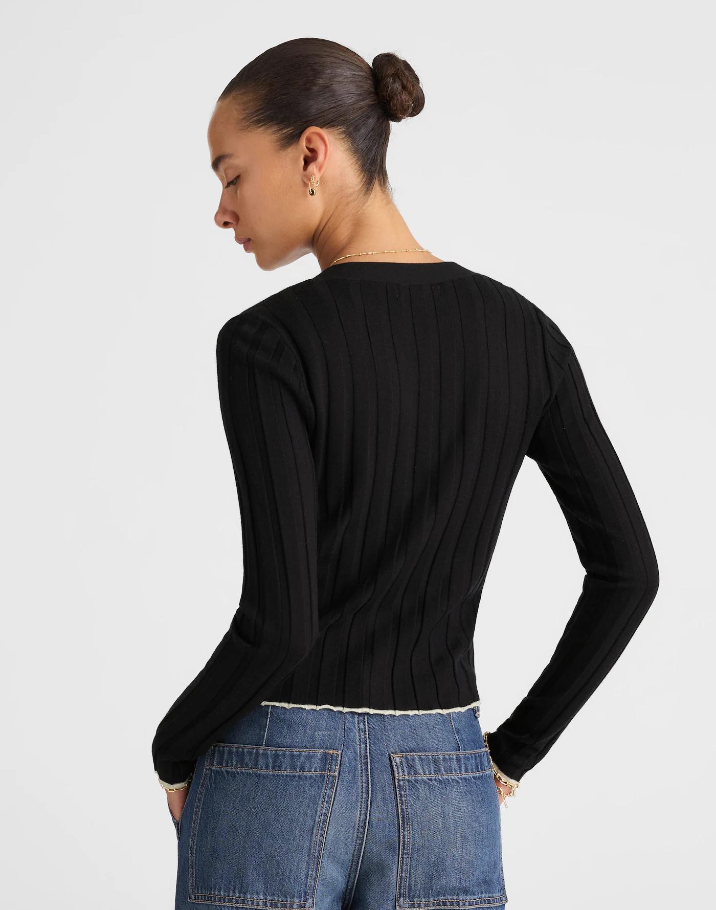 Coming in merino wool-silk blend, this wide rib-knit cardigan is finished with delicate shell buttons along the front and contrast tipping. Cozy and effortless, its flattering slim fit makes it perfect to wear solo or layered on chillier days.
