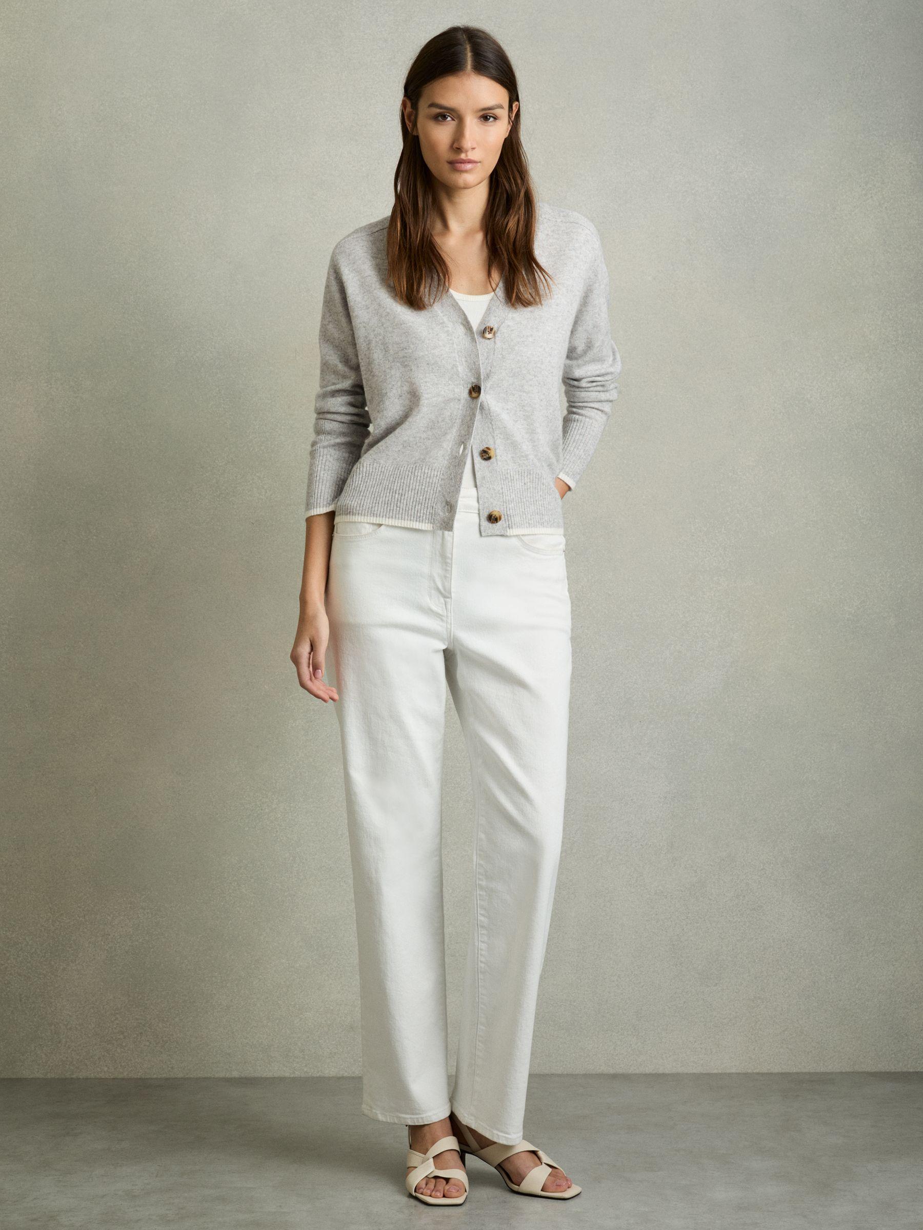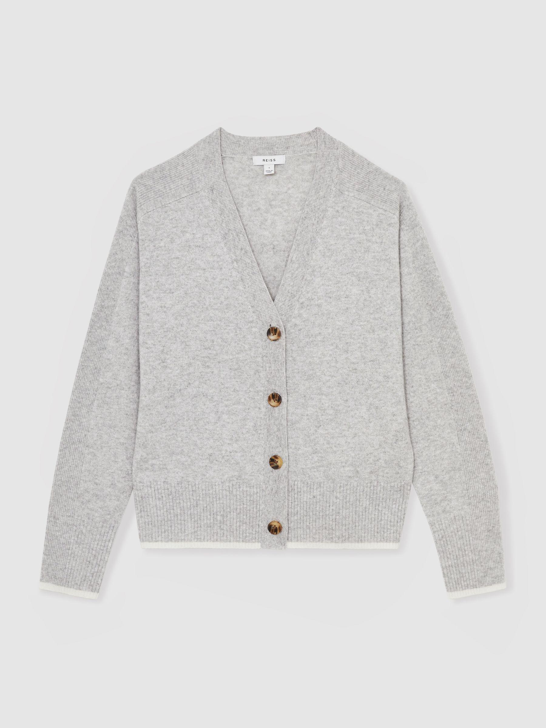The Abigail cardigan is crafted from a luxurious wool and cashmere blend for a soft, sumptuous feel. A tipped hem and cuffs adds a refined touch, whilst subtle ribbing offers a tactile finish. Crafted with wool and cashmere Mélange. Tipped cuffs and hem. Ribbed detailing. V-Neckline. Front buttons.