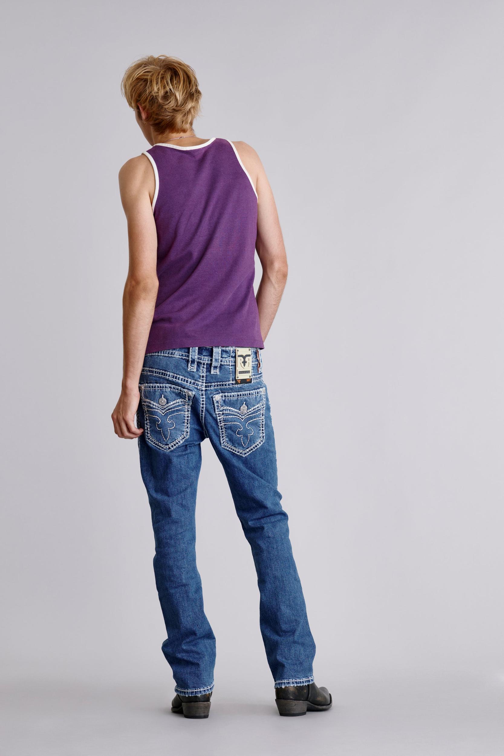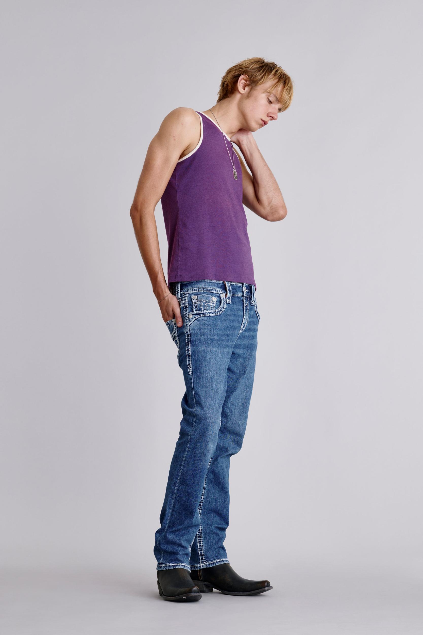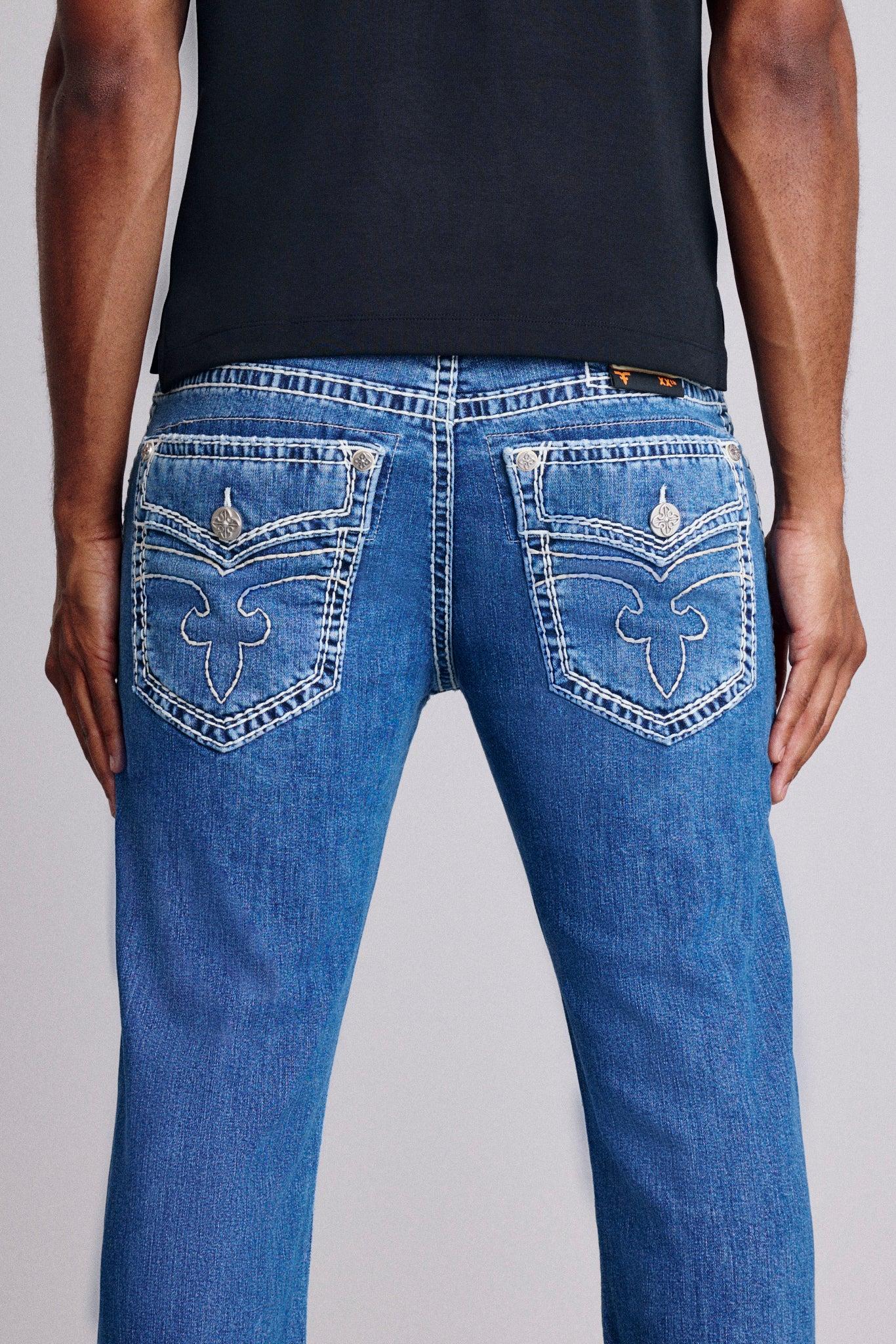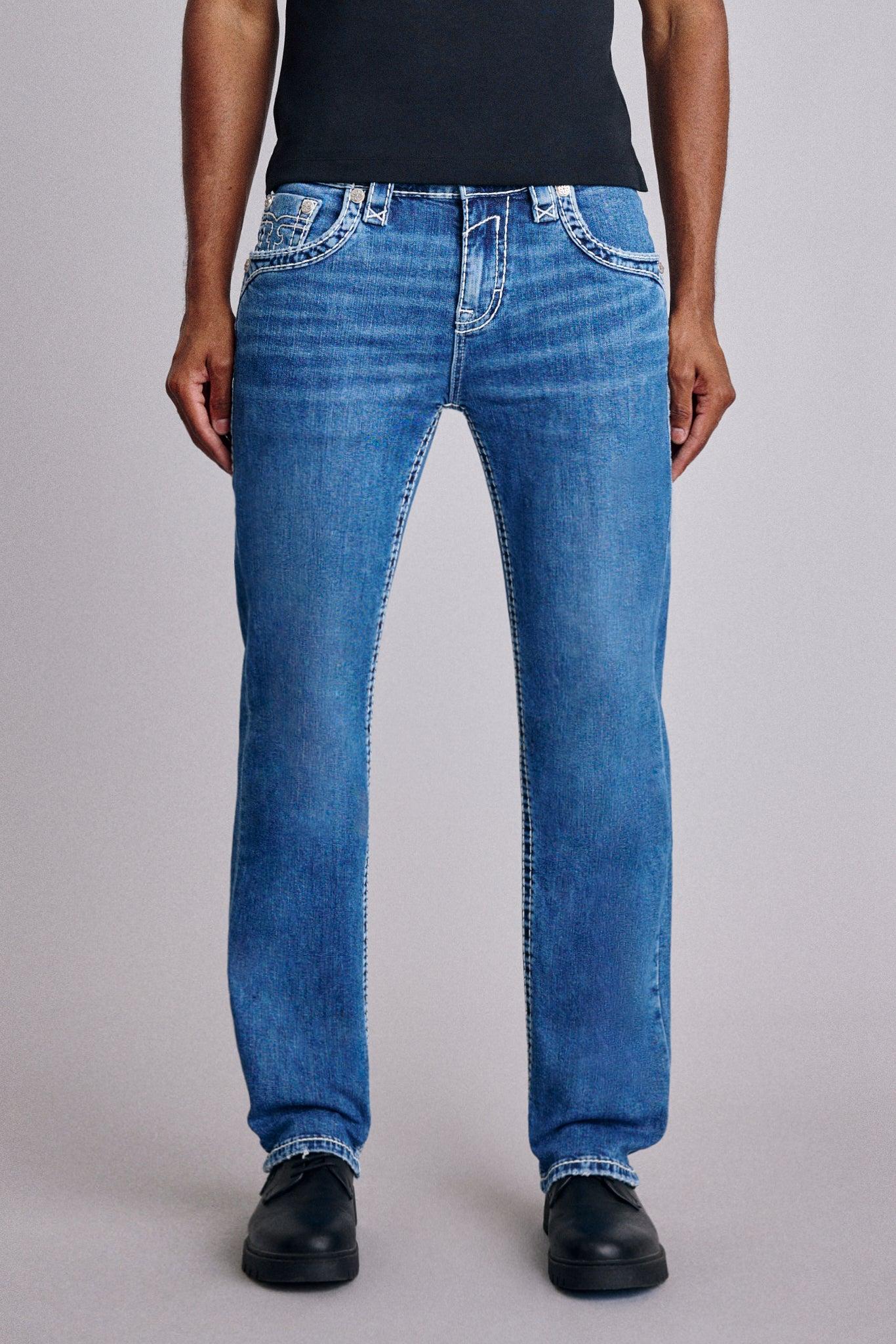 Titan Straight 2 Jeans by Rock Revival with a straight silhouette crafted in a medium wash, designed in Los Angeles. Premium stretch denim for comfort and durability Signature inverted Fleur-de-Lis embroidery Custom pewter hardware and rivets Engraved 'Rock Revival' leather waist patch