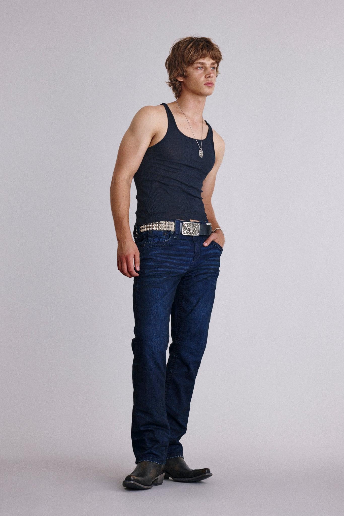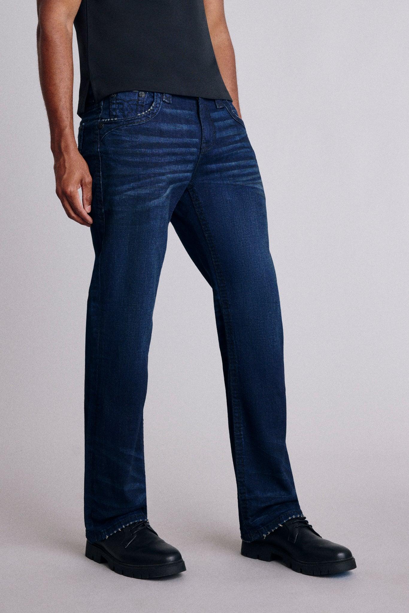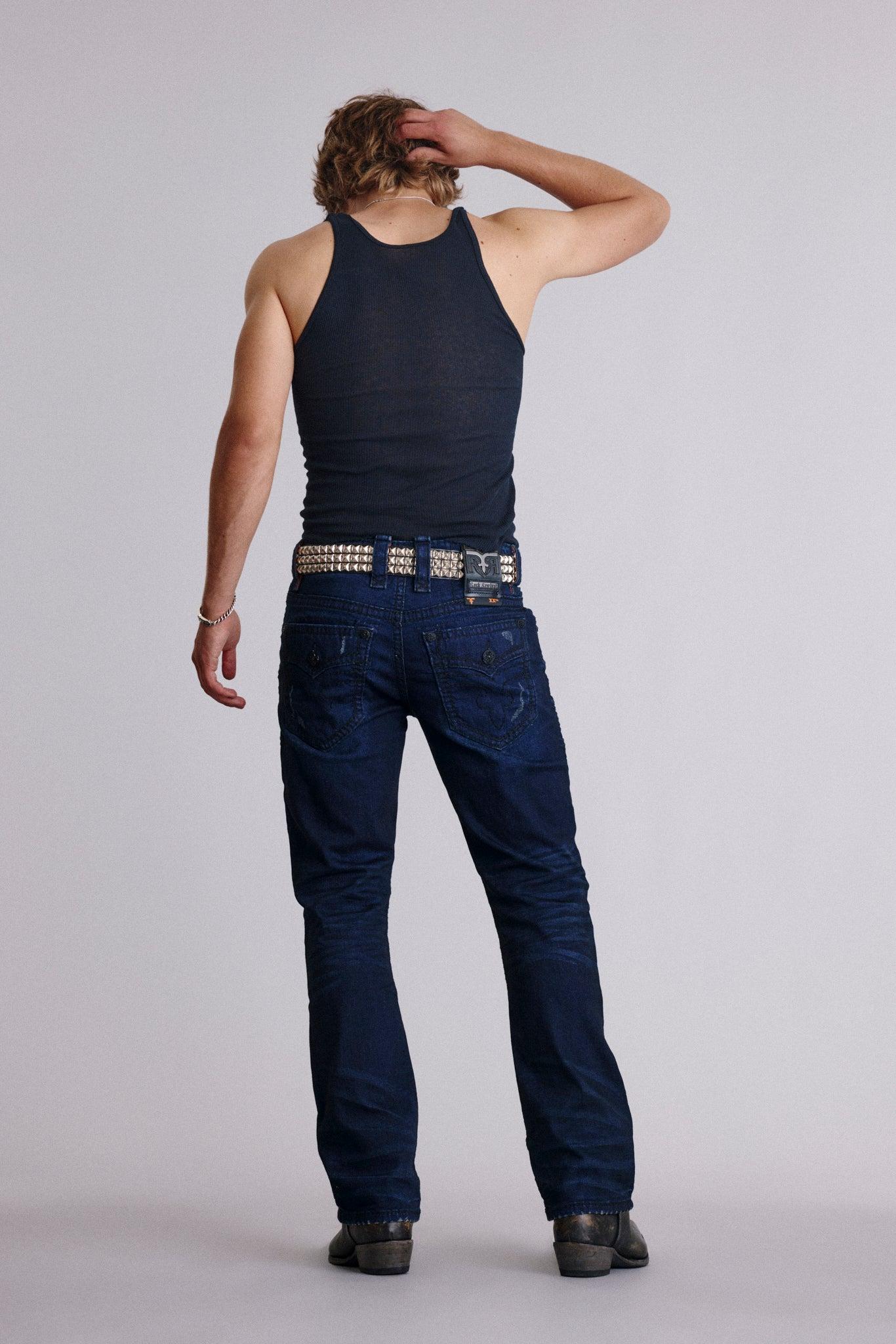 Titan Straight 2 Jeans by Rock Revival with a straight silhouette crafted in a dark blue wash, designed in Los Angeles.