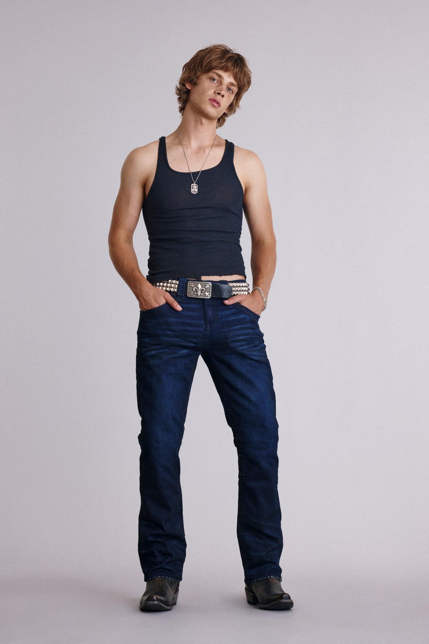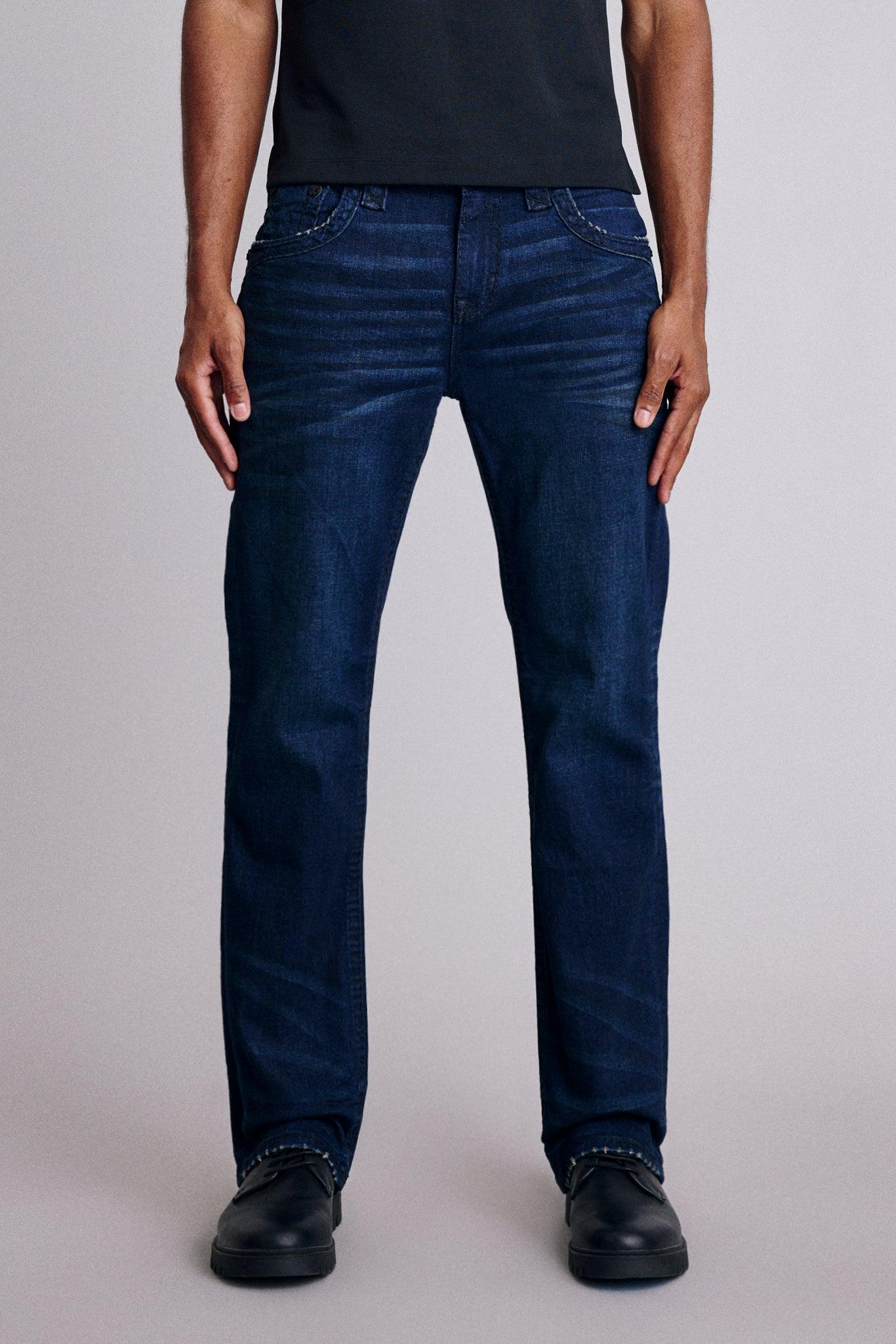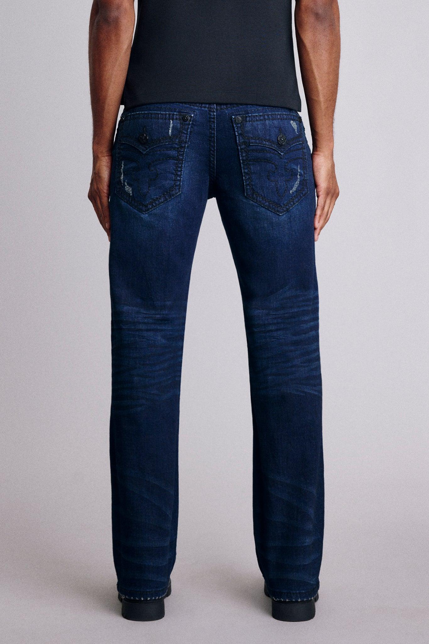 Titan Straight 2 Jeans by Rock Revival with a straight silhouette crafted in a dark blue wash, designed in Los Angeles.