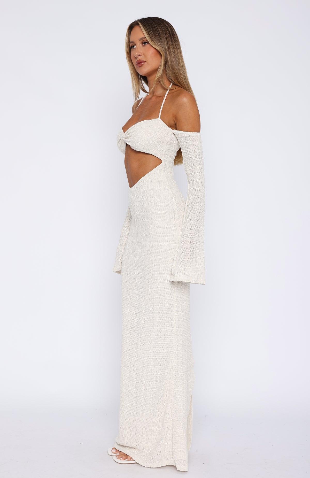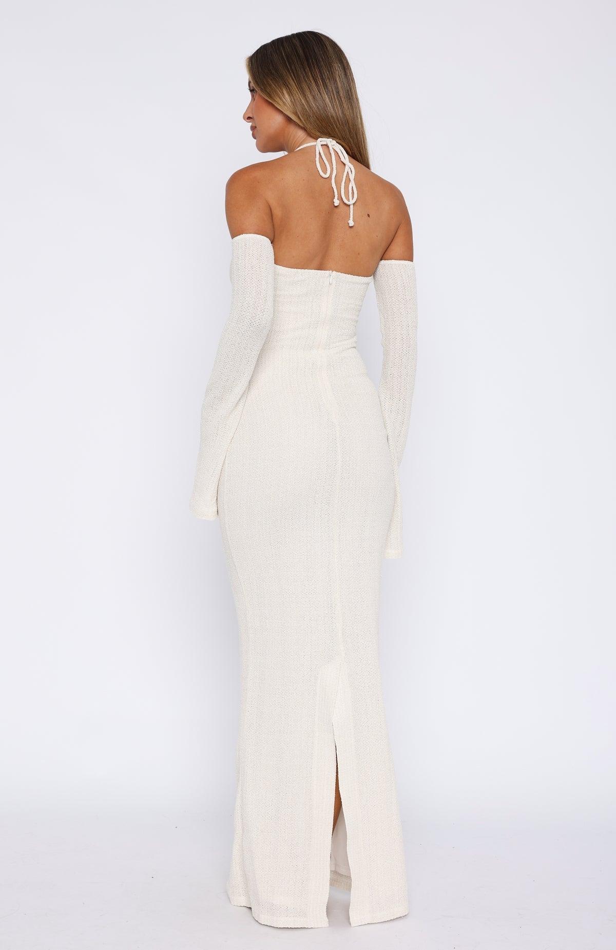 Introducing the cutest resort dress you'll ever see! The To The Beach Long Sleeve Maxi Dress Cream features a halter style neckline with self-tie straps, plunge neckline, attached long sleeve design with a slight flare, lined fabric, front cut-out design, hidden centre back zipper with hook & eye, maxi length and back split hemline. 90% Polyester 10% Elastane Em is 170cm & is wearing an XS