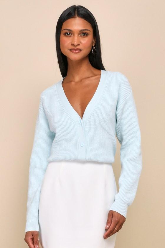Cooler days are no match for your adorable aesthetic in the Lulus Toasty Babe Light Blue Knit Button-Up Cropped Cardigan! Medium-gauge, soft and stretchy sweater knit shapes this ultra-cute cardigan that features a V-neckline framed by long sleeves with drop shoulders and fitted cuffs. Relaxed, button-up bodice falls to a trendy cropped hem. Ribbed knit accents the neck, cuffs, and hem.