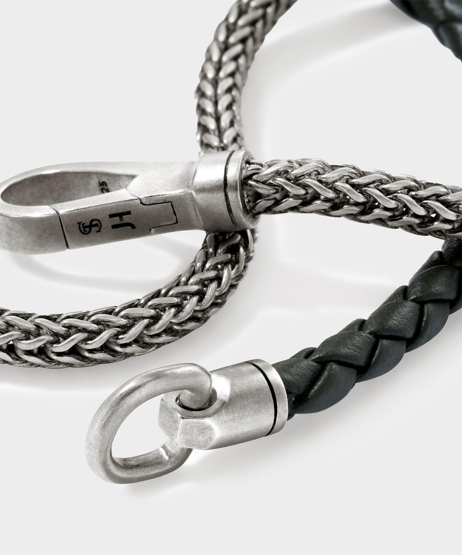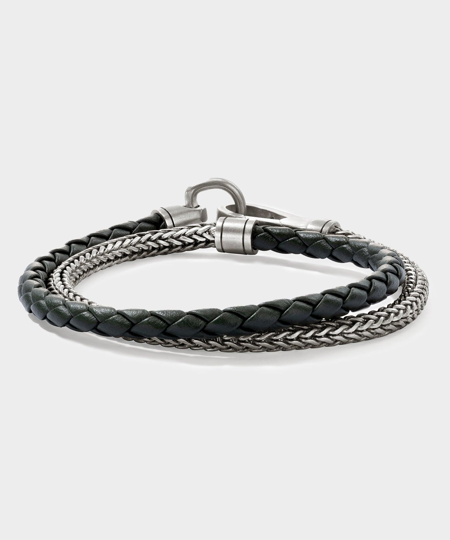 Reed Krakoff — the Creative Chairman of this storied jewelry brand — unveiled his first men’s collection in Spring 2024: chic rings, necklaces, earrings and bracelets, made by hand by Hardy artisans, using 100% reclaimed precious metals. Todd worked with the Hardy team to design this limited-edition, nautical-inspired collection. This Double Wrap Bracelet features a band that’s half reclaimed sterling silver chain and half braided leather cord. Exclusive to Todd Snyder Size L - 6.75-7.25 inches 4.5 Millimeter Reclaimed Sterling Silver Chain Braided Leather Strap Hook Clasp Designed in NYC, Made in Bali Style BU9012544GR Remove jewelry for cooking, cleaning and exercise. Do not submerge in water. Put on your jewelry as the last step of getting ready; wipe it with a soft cloth after wearing it, before storing. Use non-abrasive, bleach-free mild cleansers for cleaning sterling silver. Gently use a soft, clean toothbrush to remove dirt; do not rub with paper towels (they contain wood fibers).