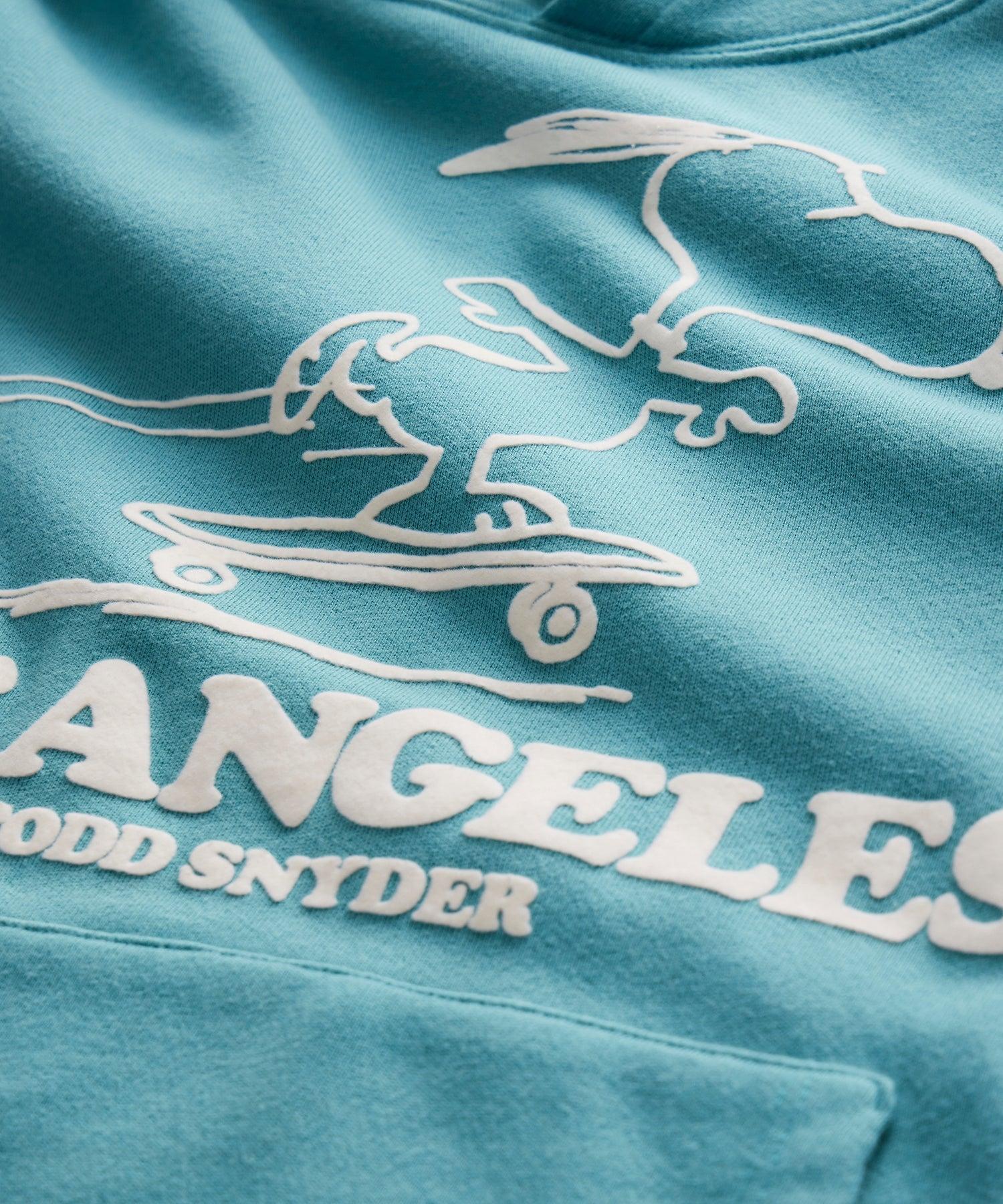 This limited-edition hoodie is part of an exclusive capsule with the Peanuts® Gang. Inspired by a vintage 70s style from Todd’s personal Champion archives, each one features a soft, chenille-like graphic highlighting a few of our favorite cities. This one for Los Angeles captures a moment of zen as Snoopy skateboards across the scene. It’s also made in LA, from one of our absolute favorite sweatshirt fabrics, a soft, plush, high-quality cotton terry. Pick your favorite or collect them all, and pull one on to add a little character to everything from tailored trousers to your go-to sweats. 100% Piece-Dyed Cotton 380 GSM French Terry Cloth Made in Los Angeles Classic Fit Single-Color Flocking Graphic Drawcord Hood Side Panels Ribbed Trim Kangaroo Pocket Custom Collection Label Machine Wash Cold