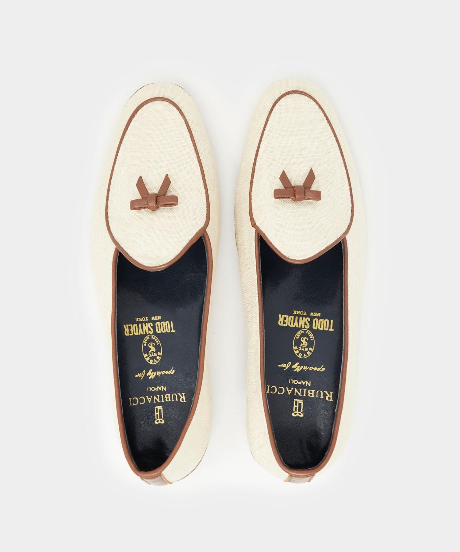 Mr Luca Rubinacci came up with the idea for these ‘Marphy’ loafers after failing to find smart, yet comfortable formal shoes. A shoe that is delicate, soft and designed to balance the ease and comfort of a slipper with the durability of a traditional loafer. Hand made in Italy, these are crafted with a linen outer and malleable leather sole, and finished with a leather trim and bow on top. This limited-edition loafer is made in Italy and exclusive to Todd Snyder. Exclusive to Todd Snyder Only available in full sizes, go up to the nearest whole size if you take a half size Not sure what your European shoe size is? Our size chart will help you out Fits true to size Linen upper Leather outsole Featuring custom insole and shoe bag made "specially" for Todd Snyder Made in Italy Style MARFY1