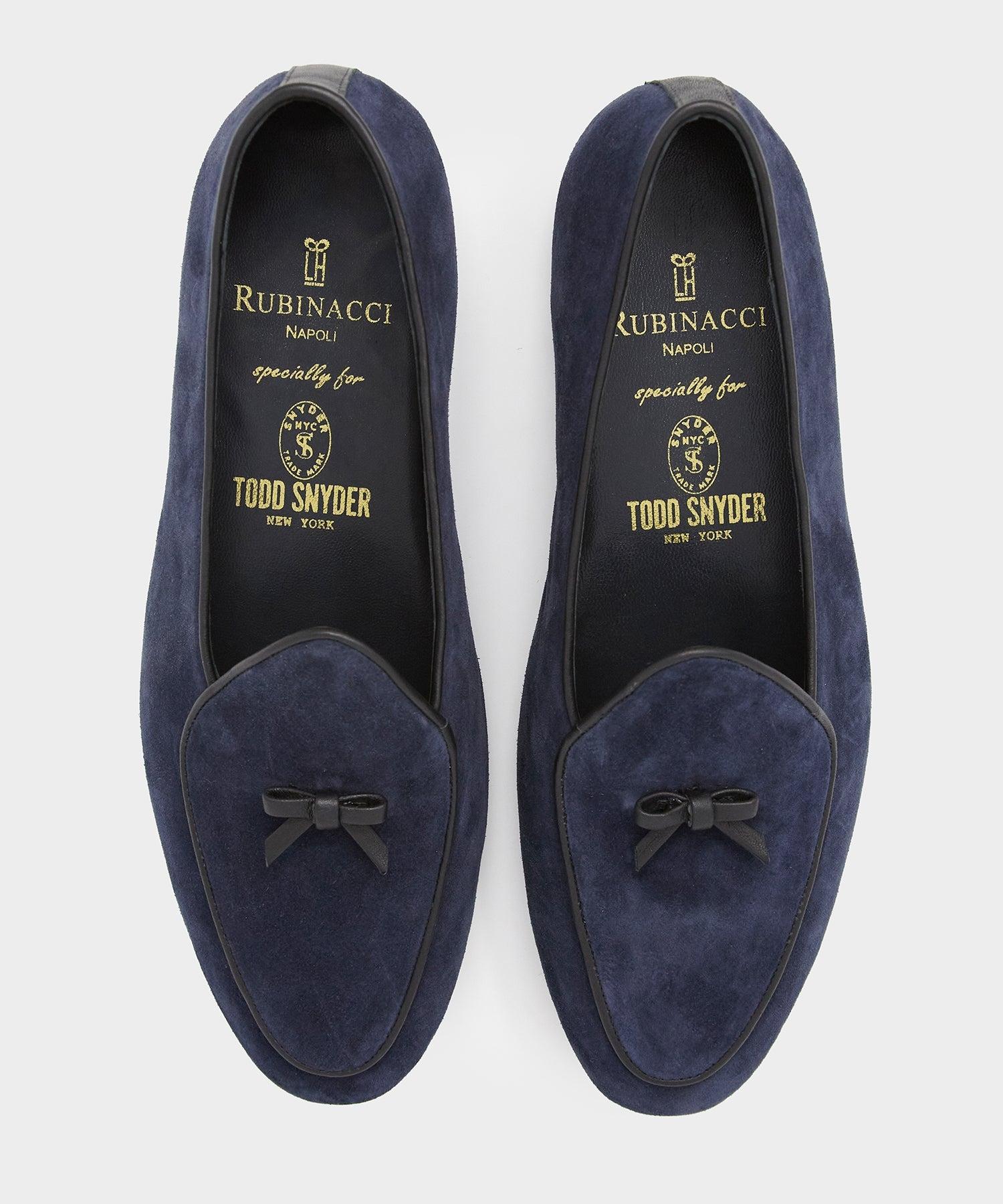 Mr Luca Rubinacci came up with the idea for these ‘Marphy’ loafers after failing to find smart, yet comfortable formal shoes. A shoe that is delicate, soft and designed to balance the ease and comfort of a slipper with the durability of a traditional loafer. Hand made in Italy, these are crafted with a suede leather outer and malleable leather sole, and finished with a leather trim and bow on top. Exclusive to Todd Snyder Only available in full sizes, go up to the nearest whole size if you take a half size Not sure what your European shoe size is? Our size chart will help you out Fits true to size Suede upper Leather outsole Leather lining Featuring custom insole and shoe bag made "specially" for Todd Snyder Made in Italy Style MARFY1465 Rubinacci was founded in 1932 by Gennaro Rubinacci. Today, the world-renowned European atelier is run by the third generation of the Rubinacci family.