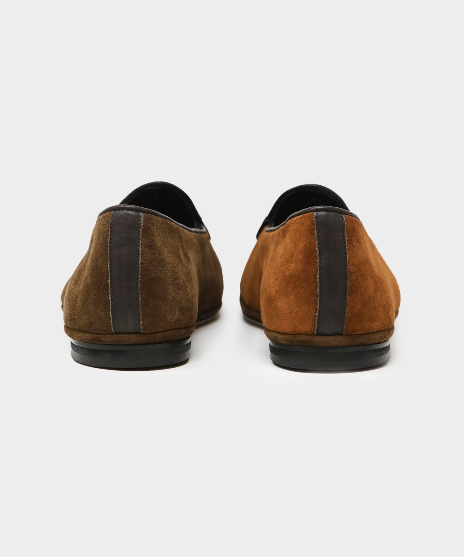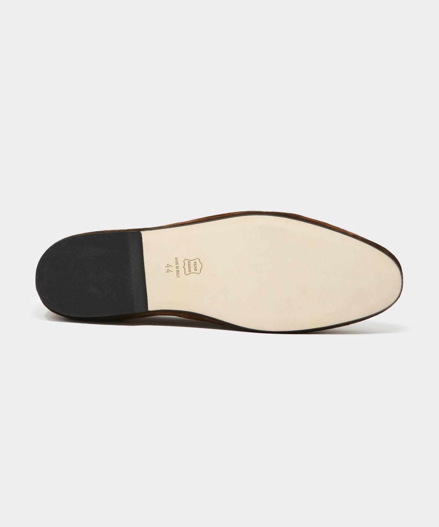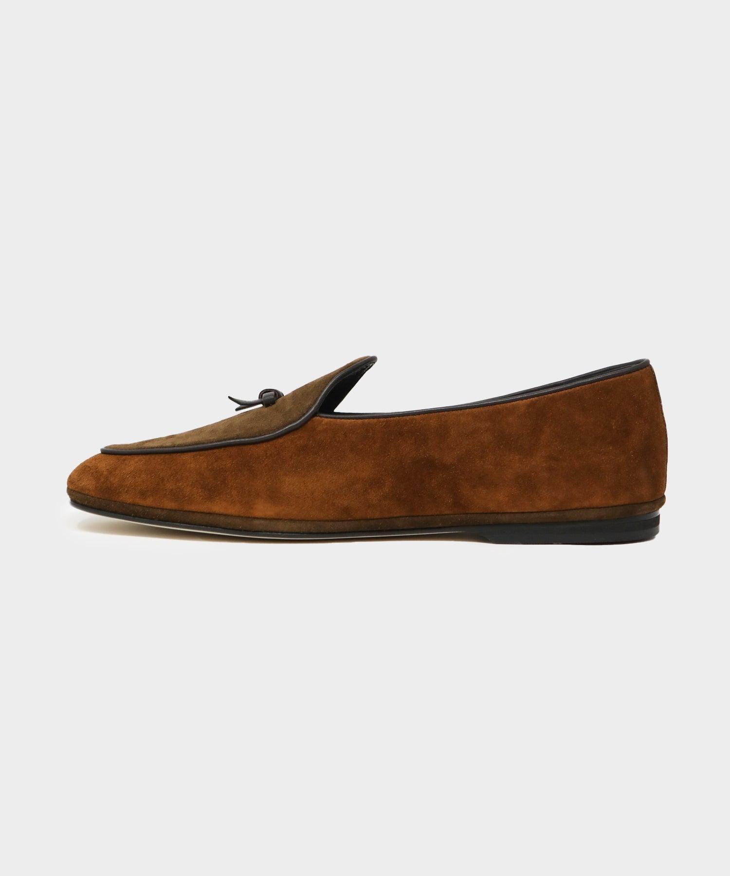 After failing to find smart (but still comfortable) formal shoes, Luca Rubinacci designed these. Known as the Belgian Loafer, it’s delicate and soft, designed to balance the ease and feel of a slipper with the durability of a traditional loafer. Handmade in Italy and built to last a lifetime, these are crafted from color-blocked suede, and finished with leather trim and Rubinacci’s signature bow on top. Because these are only available in full sizes, if you take a half size we’d recommend going up to the nearest whole size. Rubinacci was founded in 1932 by Gennaro Rubinacci. Today, the world-renowned European atelier is run by the third generation of the Rubinacci family. Exclusive to Todd Snyder Fit is True to Size Color blocked Suede Upper Leather Trim and Accents Rubber Sole Style MARFY314-121 Size Chart EU UK US 40 6 7 41 7 8 42 8 9 43 9 10 44 10 11 45 11 12 46 12 13