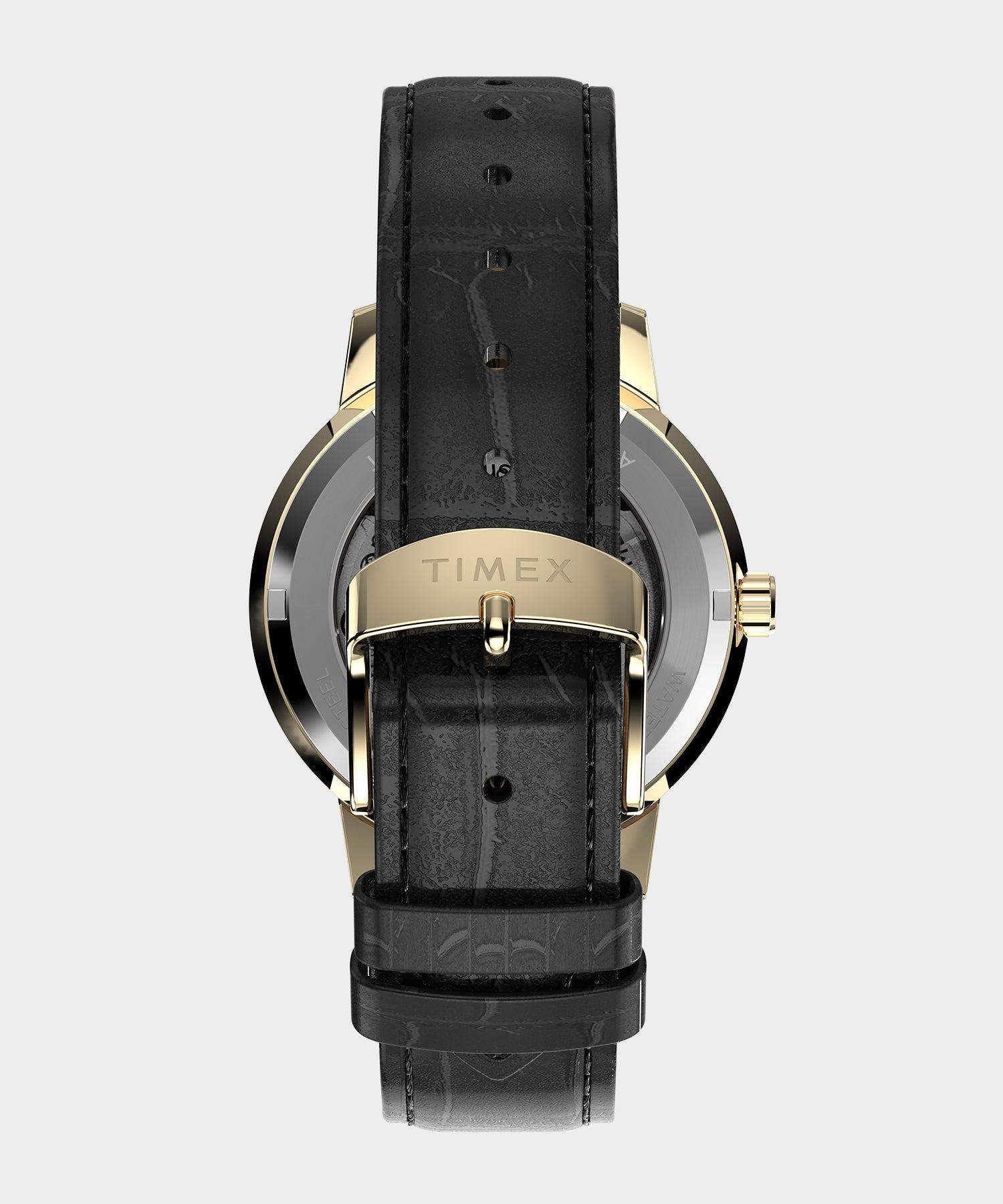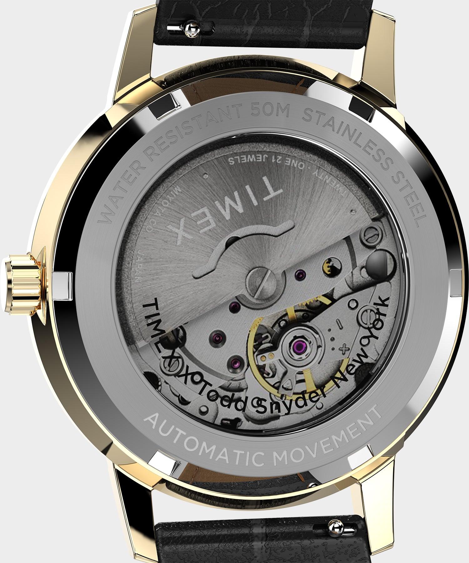 td {border: 1px solid #cccccc;}br {mso-data-placement:same-cell;}Todd's latest collaboration with Timex, a sleek update to the 60s Marlin Automatic, is designed for those who appreciate refined simplicity. Presenting a subtle yet striking black and gold color profile, the Timex X Todd Snyder Black Marlin commands attention on the wrist without demanding it. Its 38mm stainless-steel case is finished in a polished gold-tone, matching the sharp handset and full Arabic index standing boldly against the black dial. The modest case size pairs handsomely with a black leather strap, complete with an enticing crocodile grain pattern. Its understated elegance is enhanced by a vintage-style domed acrylic crystal that stays true to Timex's mid-century Marlin, while a 21-jewel Japanese automatic movement powered by the natural motion of your wrist can be admired through an exhibition caseback. Limited-Edition Collab ; Stainless Steel Gold-Tone Case ; Black Dial ; Japanese Automatic Movement ; Leather Strap with Crocodile Pattern; 50M Water Resistance; 38mm Case, 18mm Lug ;
