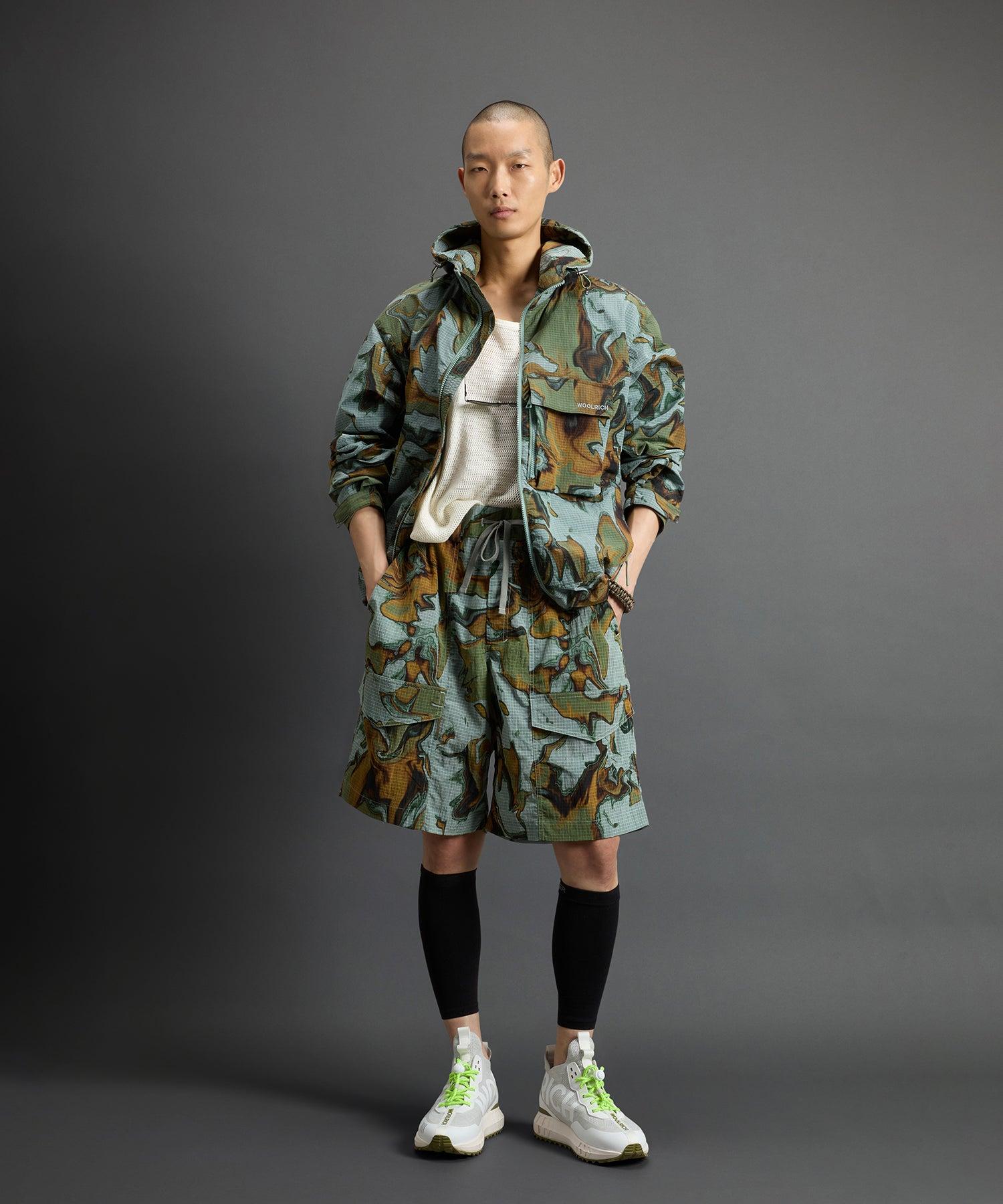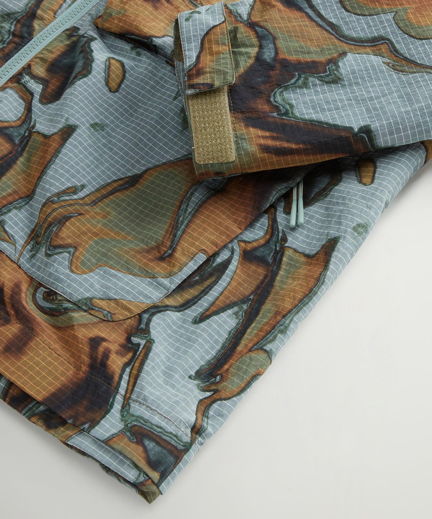 Practical and chic, this Jacket and Short set is made from water-repellent Italian ripstop, crafted by the experts at Olmetex, a world-renowned mill established in 1954 in Italy’s Como region. Ripstop is a military innovation, often used in uniforms and parachutes — it's woven using a special technique that creates a fine crosshatch pattern, making it both lightweight and incredibly resistant to tearing. The Jacket and Shorts are printed with a unique, tie-dye oil emulsion technique that (unsurprisingly) resembles oil on water, or a heat map. As Creative Director of Woolrich’s Black Label, Todd has designed a collection of rugged yet luxurious takes on the nearly 200-year-old brand’s iconic styles that marry Woolrich’s innovative technical fabrics with sartorial flourishes. 100% Polyamide Jacket is Fully Lined with a Drawcord Hood with Windguard and 2-Way 5-Gauge Zipper Shorts have 9" Inseam and Elastic Drawstring Waist with Belt Loops Fabric From Italy