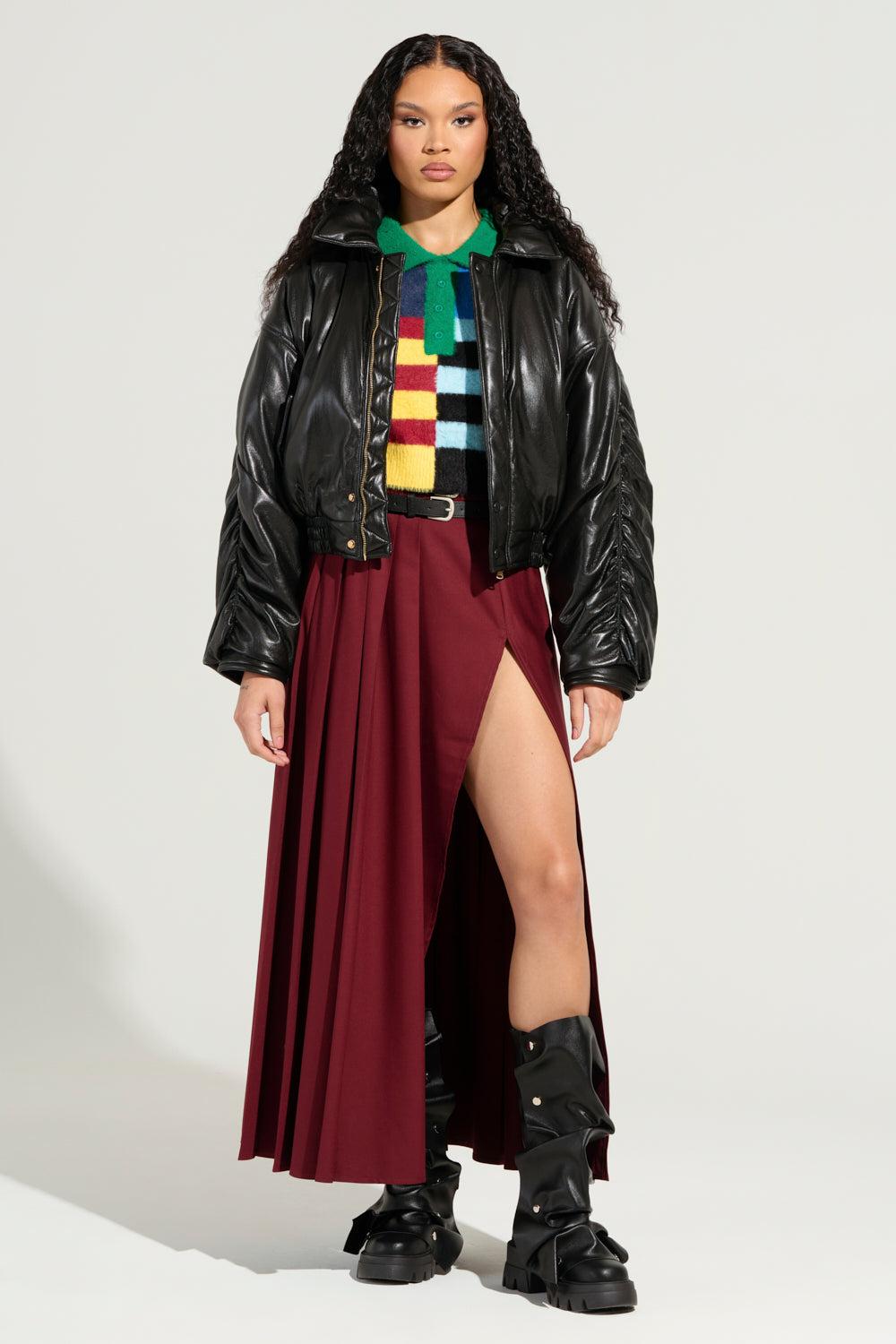 Go full speed ahead in The AKIRA Label Tokyo Drifting Faux Leather Bomber. This timeless outerwear piece is crafted from a buttery soft faux leather base and features a fold-over pointed collar, long sleeves with ruched detailing running down the sides and snap button cuffs, side slant snap button front pockets, an elastic waistband, and sleek inner lining. Complete with a faux gold metallic front zipper, tonal snap button closures, all-over padding for ultra comfort, and a cropped, boxy silhouette. Pair with baggy cargo pants and platform booties to hit the ground running. - 50% PU 50% Polyester- Hand Wash or Dry Clean- Stretchy- Imported (all measurements approximate from size small)- 17” Shoulder to Hem- 20” Sleeves- 24” Shoulder to Shoulder- Model is 5’11” and is wearing size smallProduct ID: 464515 (all measurements approximate from size 1X)- 20” Shoulder to Hem- 21” Sleeves- 26” Shoulder to ShoulderProduct ID: 464519