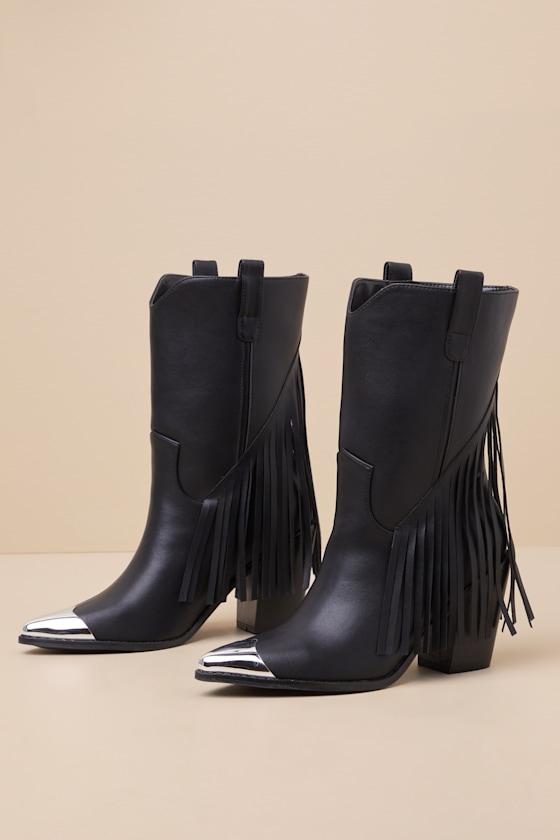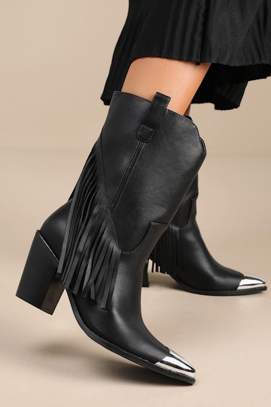 Every fun-loving girlie will be obsessed with the vibe that the Lulus Toleson Black Fringe Pointed-Toe Mid-Calf Western Boots are giving! Smooth faux leather shapes these Western-inspired boots with a classic pointed upper adorned with a shiny silver toe cap, a seamed vamp, and an 8" mid-shaft with a notched collar at the 14.5 circumference. Pull tabs at the instep and outstep allow for easy on-and-off, while long fringe around the shaft completes the trendy design!