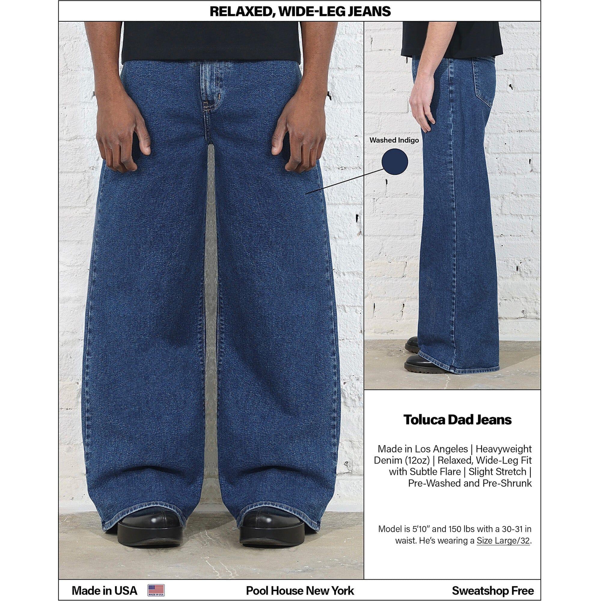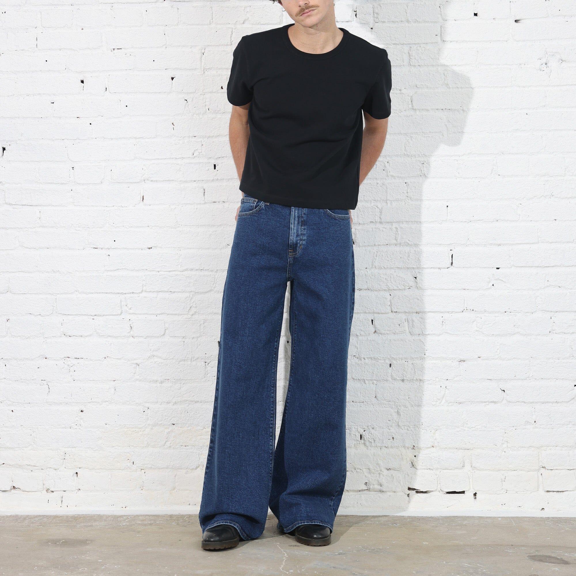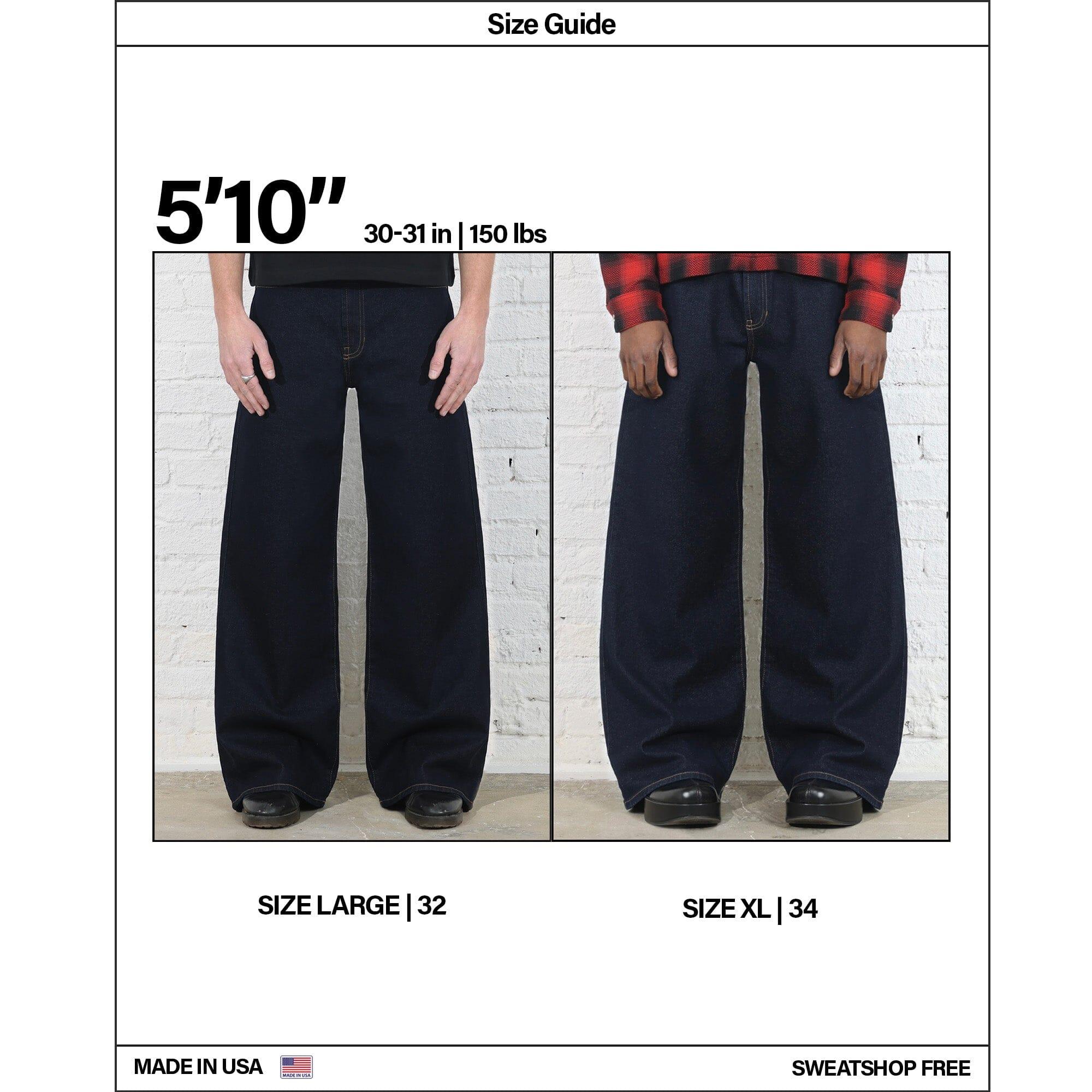 Garment Details: Made in Los Angeles. Pre-Washed and Pre-Shrunk. Heavyweight Indigo Denim (12 oz | 96% Cotton | 4% Elastane). Relaxed Wide-Leg Jean with a Subtle Flare and Slight Stretch.