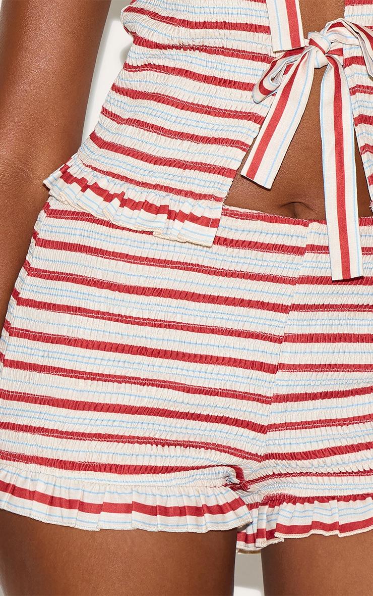 Say hello to your new seasonal staple with these tomato red stripe extreme shirred hot Pants. Crafted from red and white striped material, these shorts feature a shirred finish with a frilled hem. For the ultimate fashion-forward two piece set look, team them with the matching top, strappy kitten heels and minimalistic gold earrings. Length approx 33cm/13inch (Based on sample size US 4)Model wears size UK 8/ EU 36/ AUS 8/ US 4Model Height - 5ft 9inchp]:!mb-4inch>Brand: PrettyLittleThingCategory: Co-ordsProduct type: Hot PantColor: Tomato RedMaterial: Cotton PoplinNeckline: CrewSleeves: SleevelessOccasion: Day