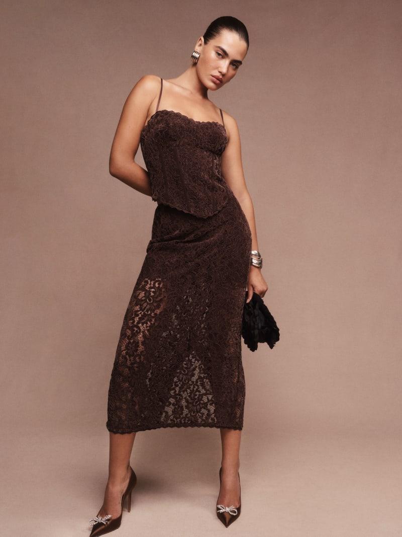 Better together. Shop the Tommen Two Piece from Reformation, a two-piece lace set with a sleeveless top and matching midi skirt.