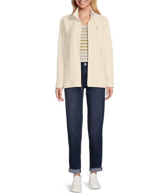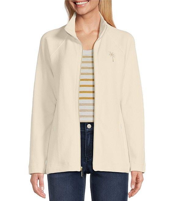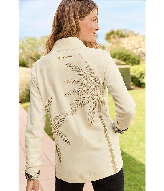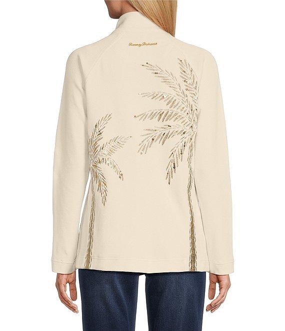 From Tommy Bahama, this jacket features: Knit fabrication Stand collar neckline Long sleeves Gold-embroidered palm tree design Sequin detailing Side seam pockets Unlined Straight hemline Front zipper closure Approx. 24" length Cotton/spandex Machine wash Imported.