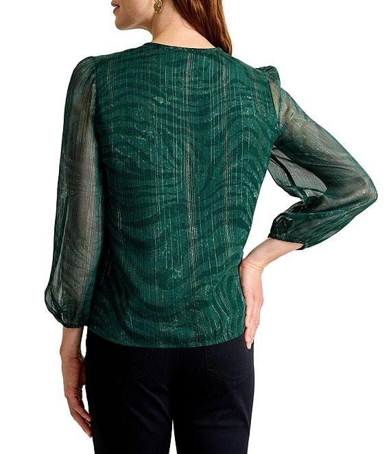 From Tommy Bahama, this top features: Crinkle georgette fabrication Zebra print Keyhole neckline with shell button closure Long sleeves Elastic cuffs Lined Metallic threading details Straight hemline Pullover construction Approx. 25" length Recycled polyester/metallic Machine wash cold/line dry Imported.